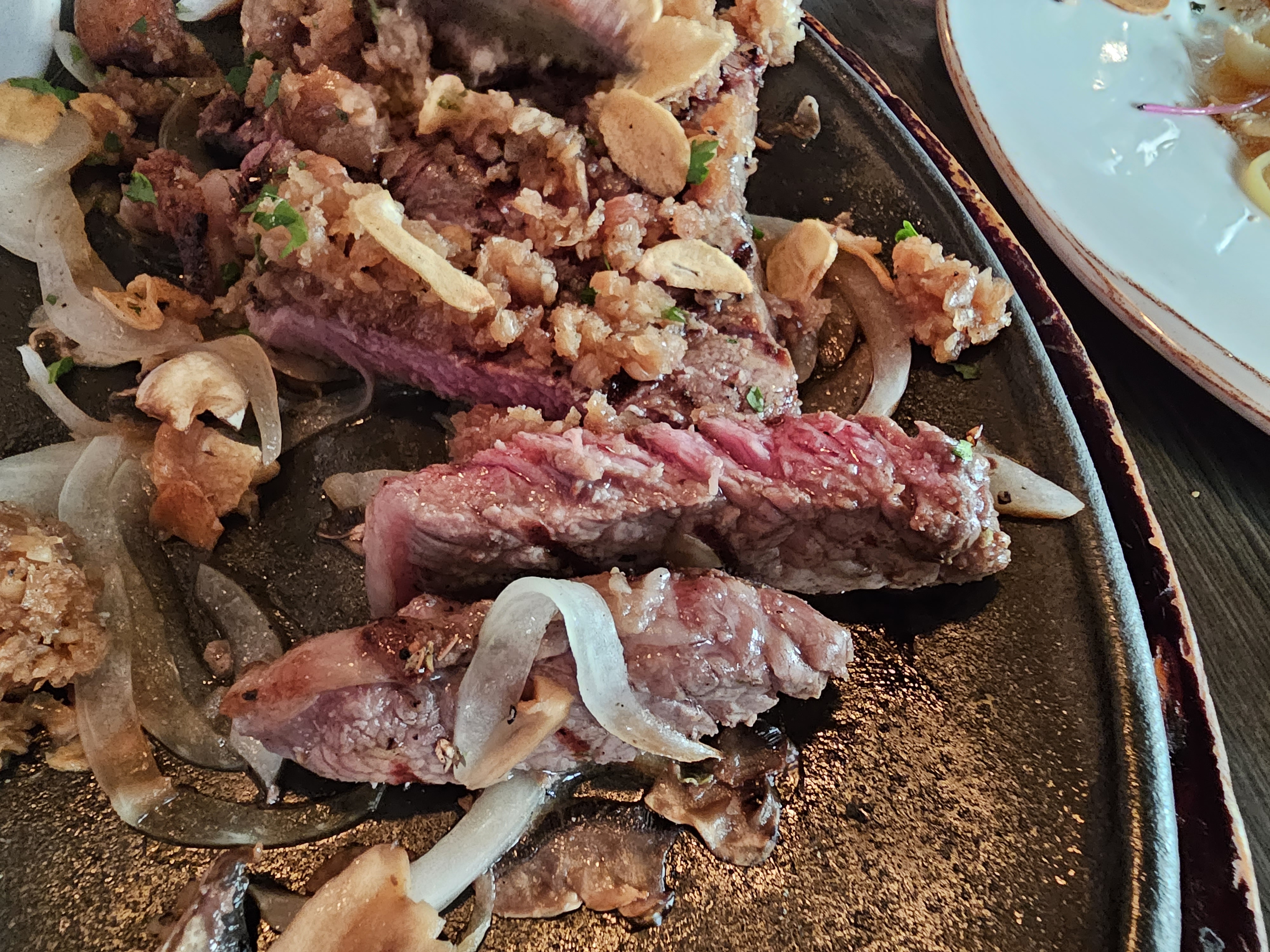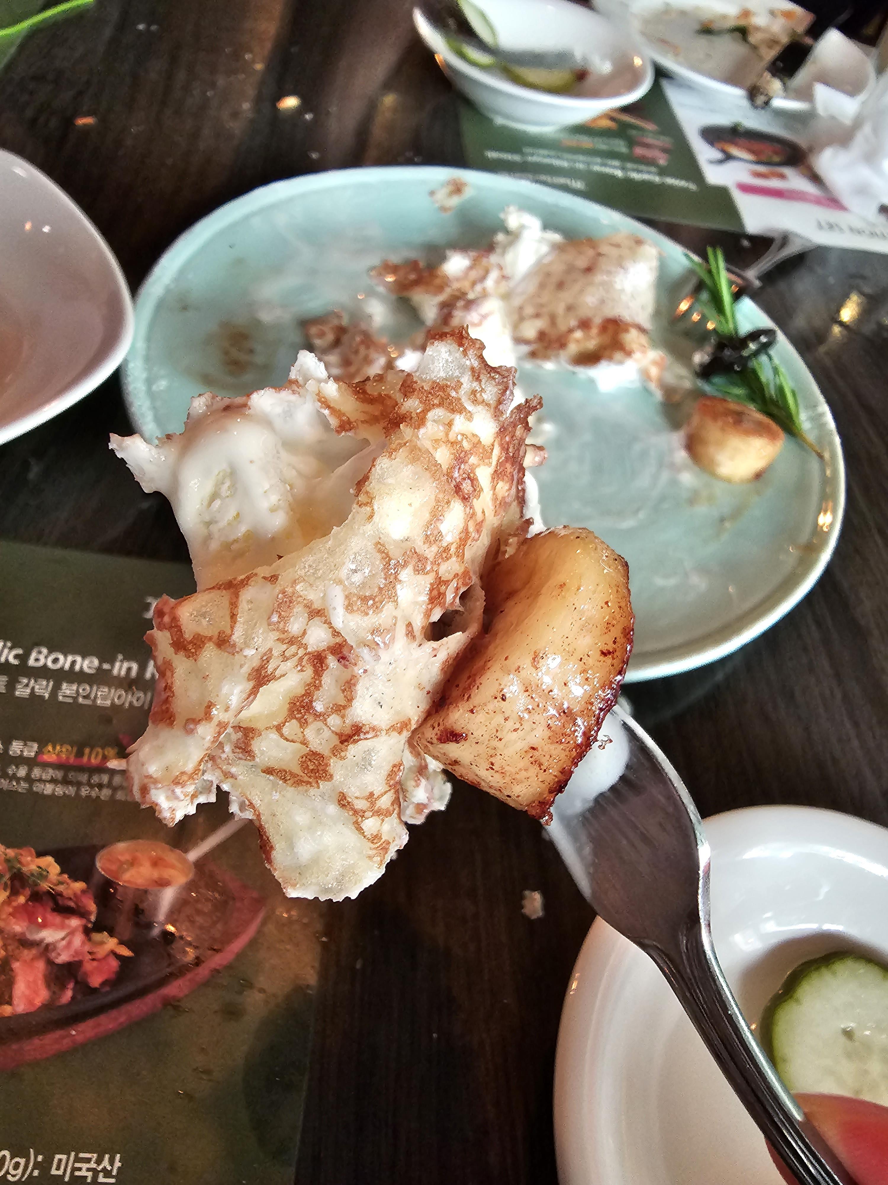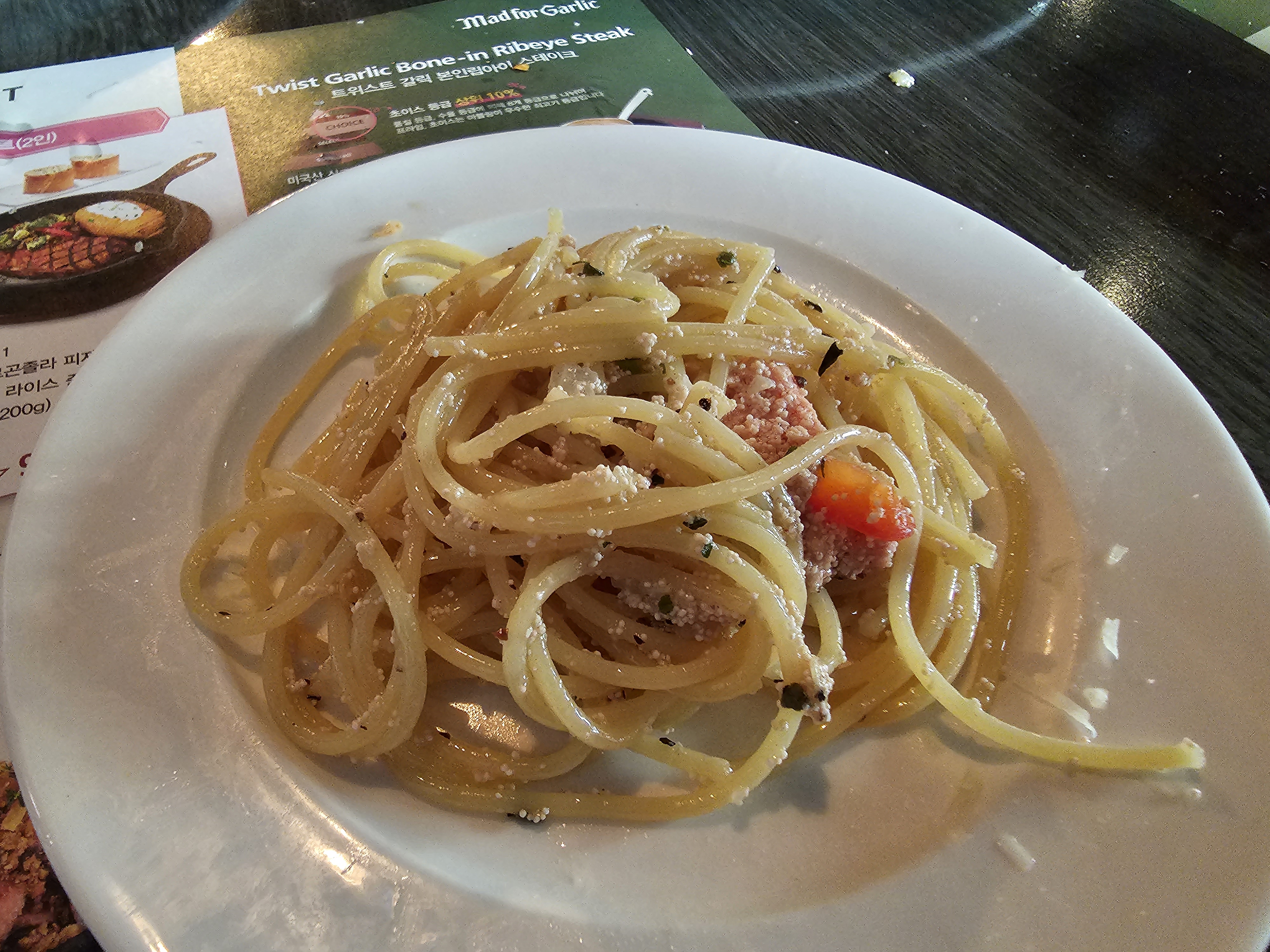 갈릭 스테이크는 미디움으로 주문했습니다. 개인적으로 스테이크를 엄청 좋아하는 편은 아니라서 그냥저냥 위에 올라간 마늘 맛으로 먹은 것 같습니다. 매드포갈릭이라는 이름답게 스테이크 위에 마늘이 꽤 올라가 있었는데, 아래 깔린 양파가 더 많았더면 더 좋았을 것 같네요.