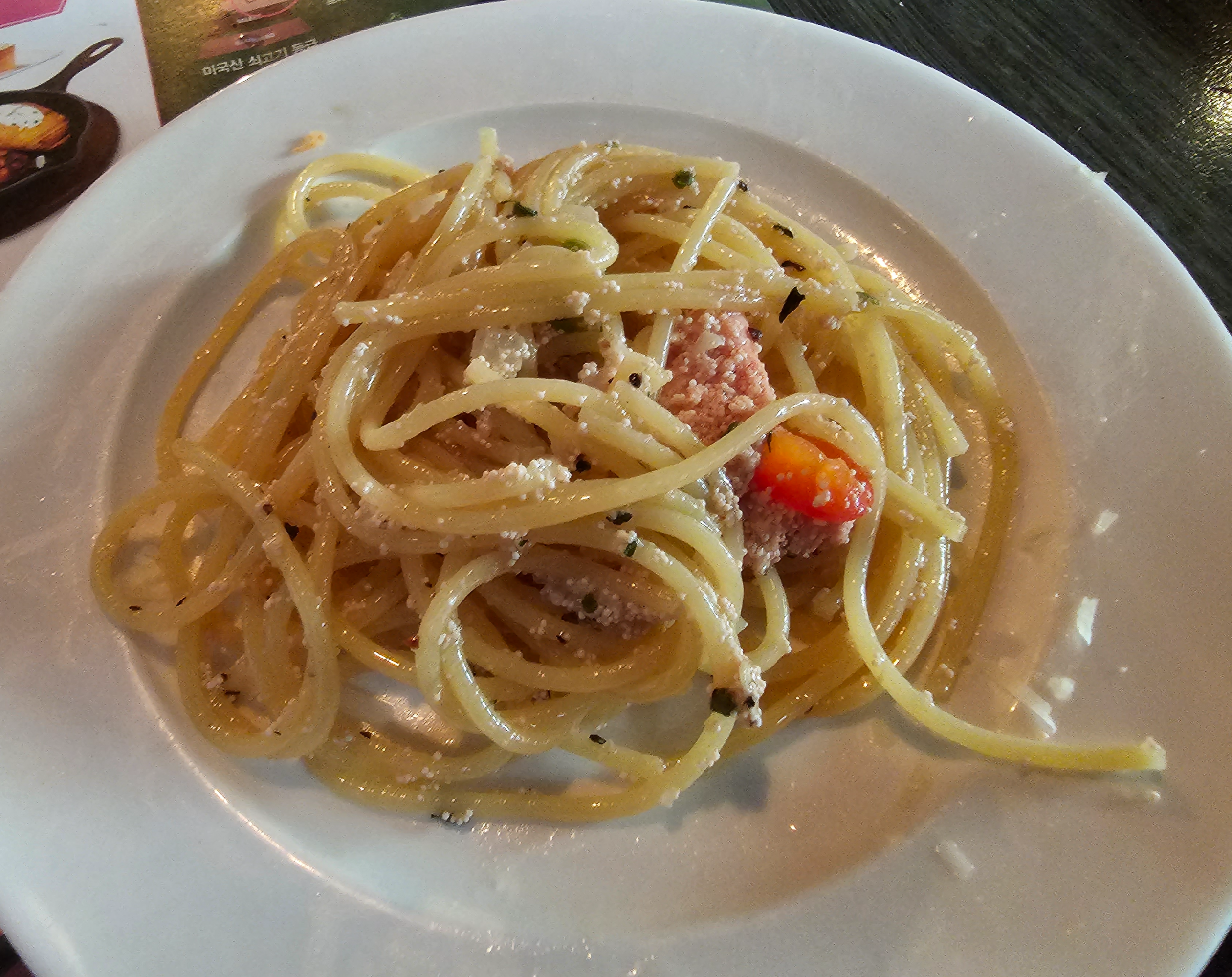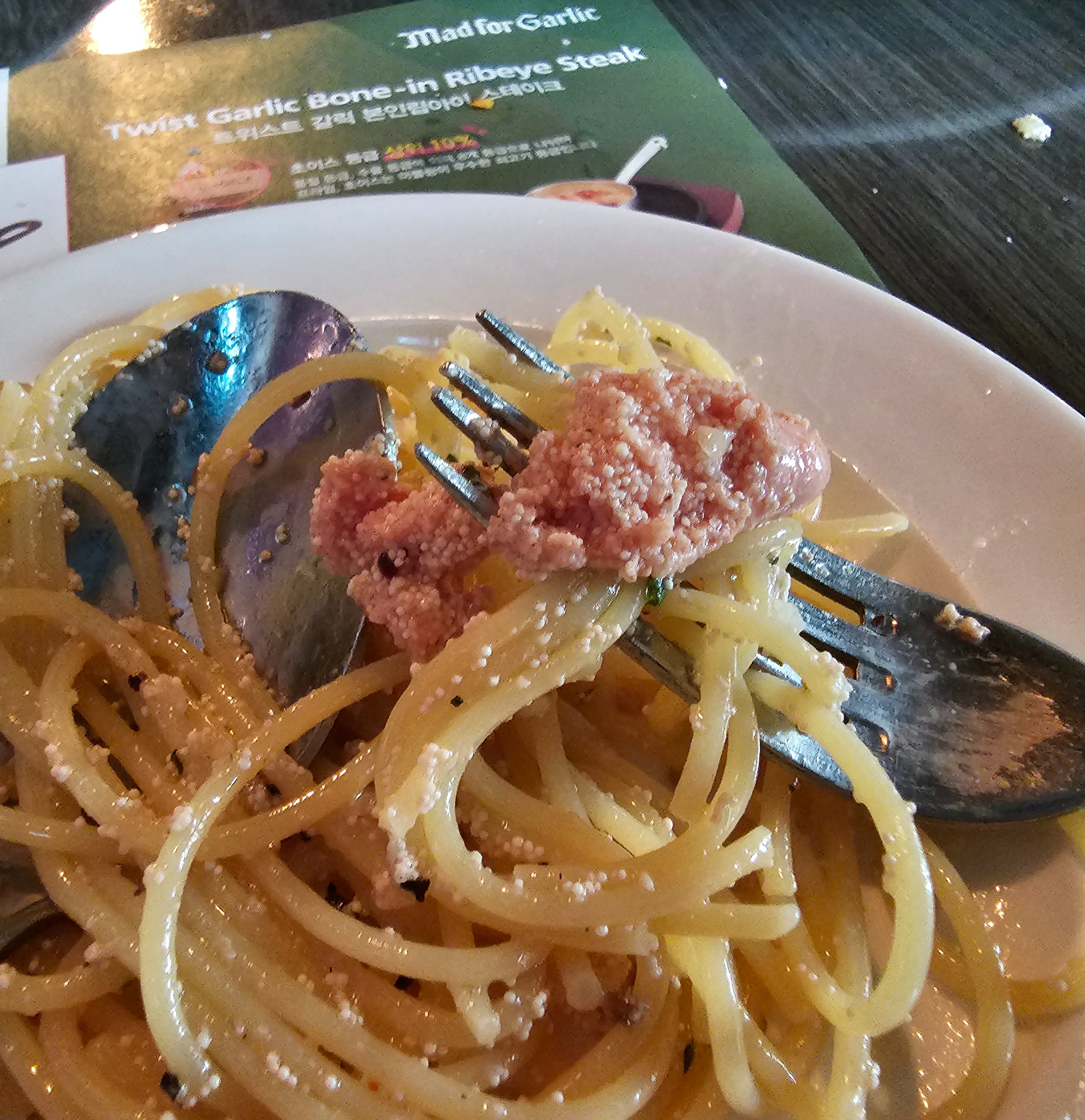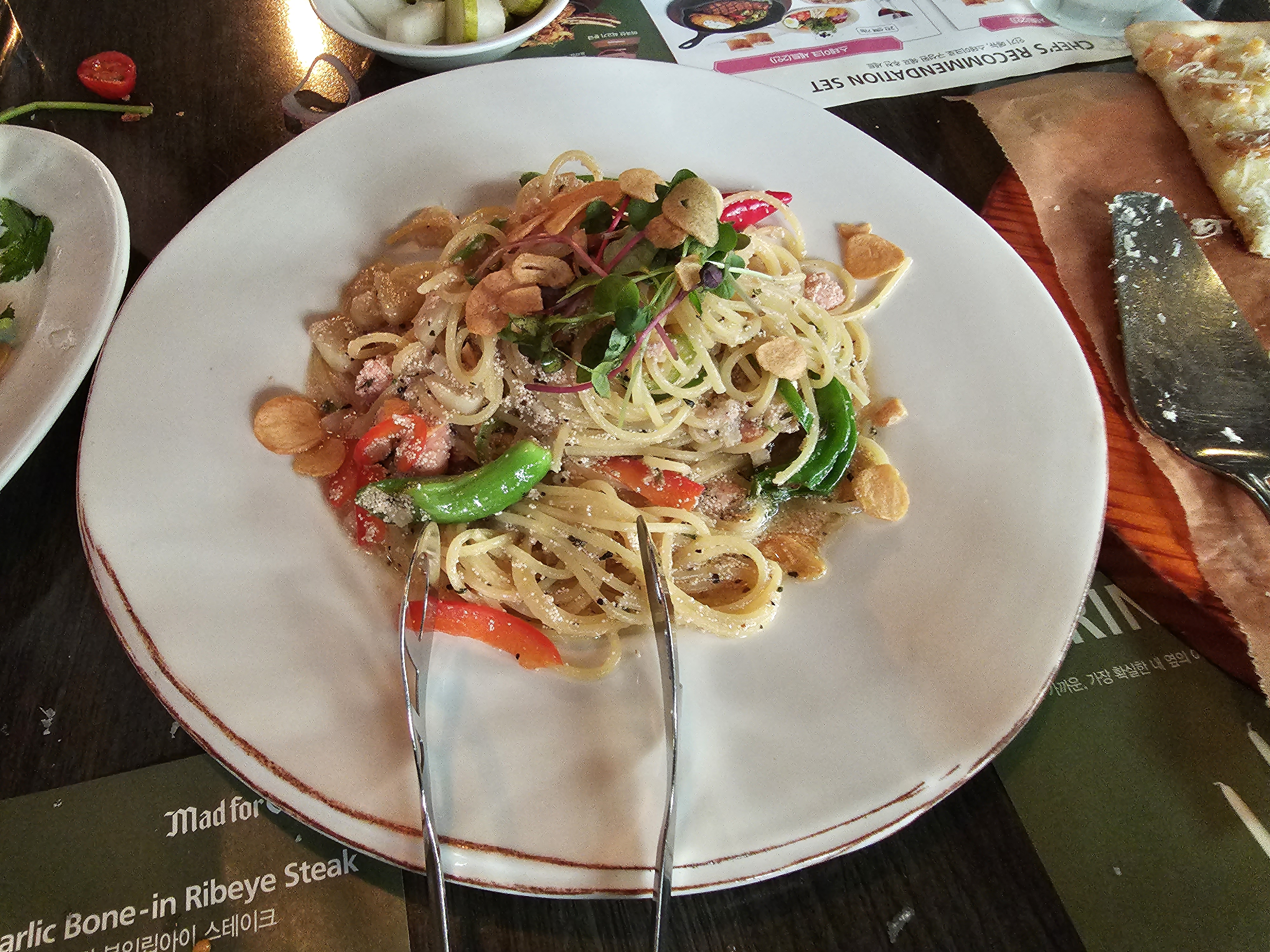 스파이시 명란 오일 파스타는 다른 식당의 명란 파스타와는 달리 명란의 껍질이 남아있고 명란이 덩어리가 크게 들어가 있었습니다. 개인적으론 명란 맛이 더 강해서 좋았습니다. 다른 야채들은 개인적으론 좀 더 가늘게 썰어서 먹는 게 파스타와 더 어울리지 않을까...라는 생각을 했네요.