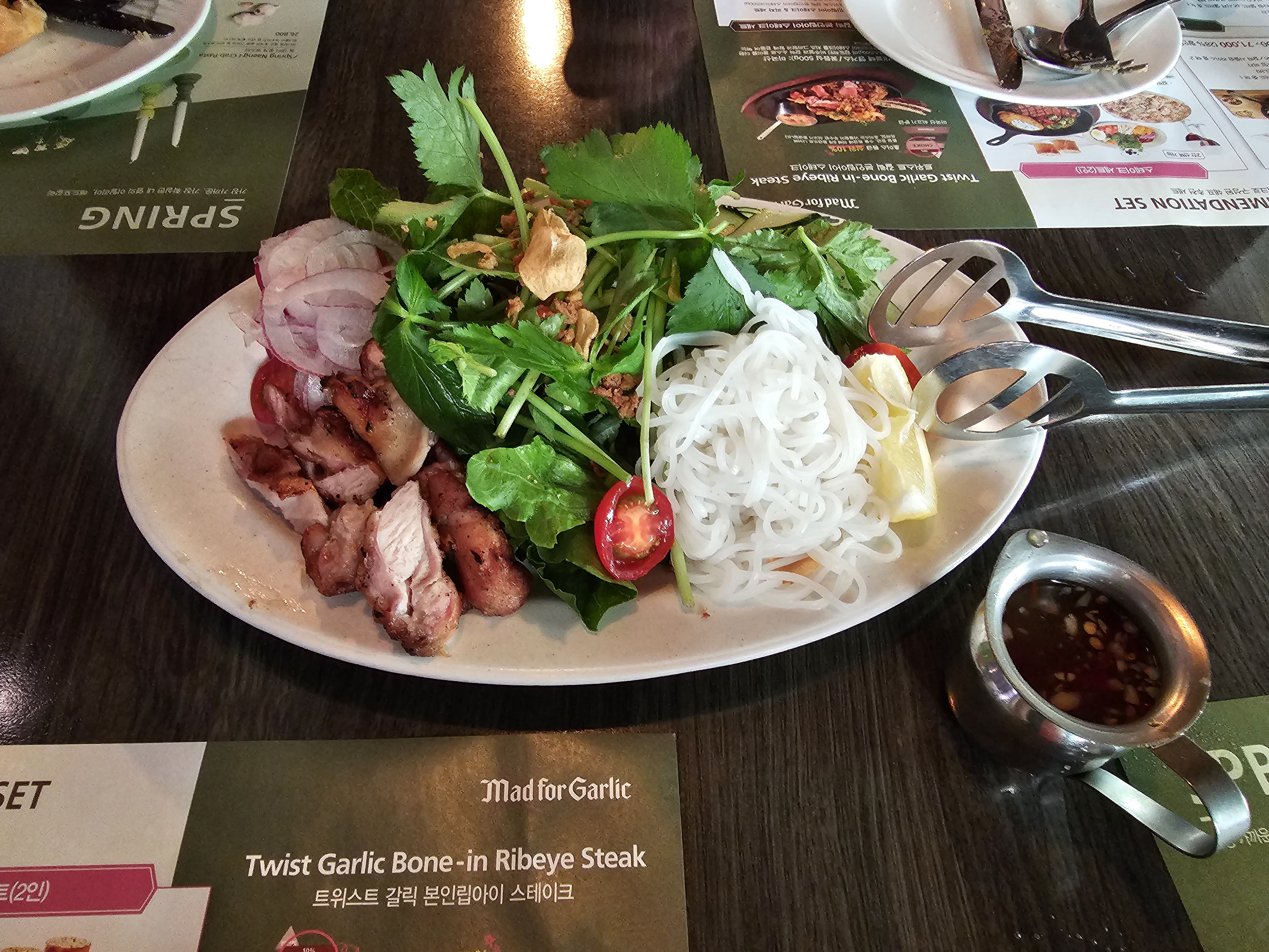 그릴드 치킨&에스닉 가든 샐러드는 피쉬소스? 같은 느낌의 소스와 함께 나오는데 동남아 음식 같은 느낌이었습니다.