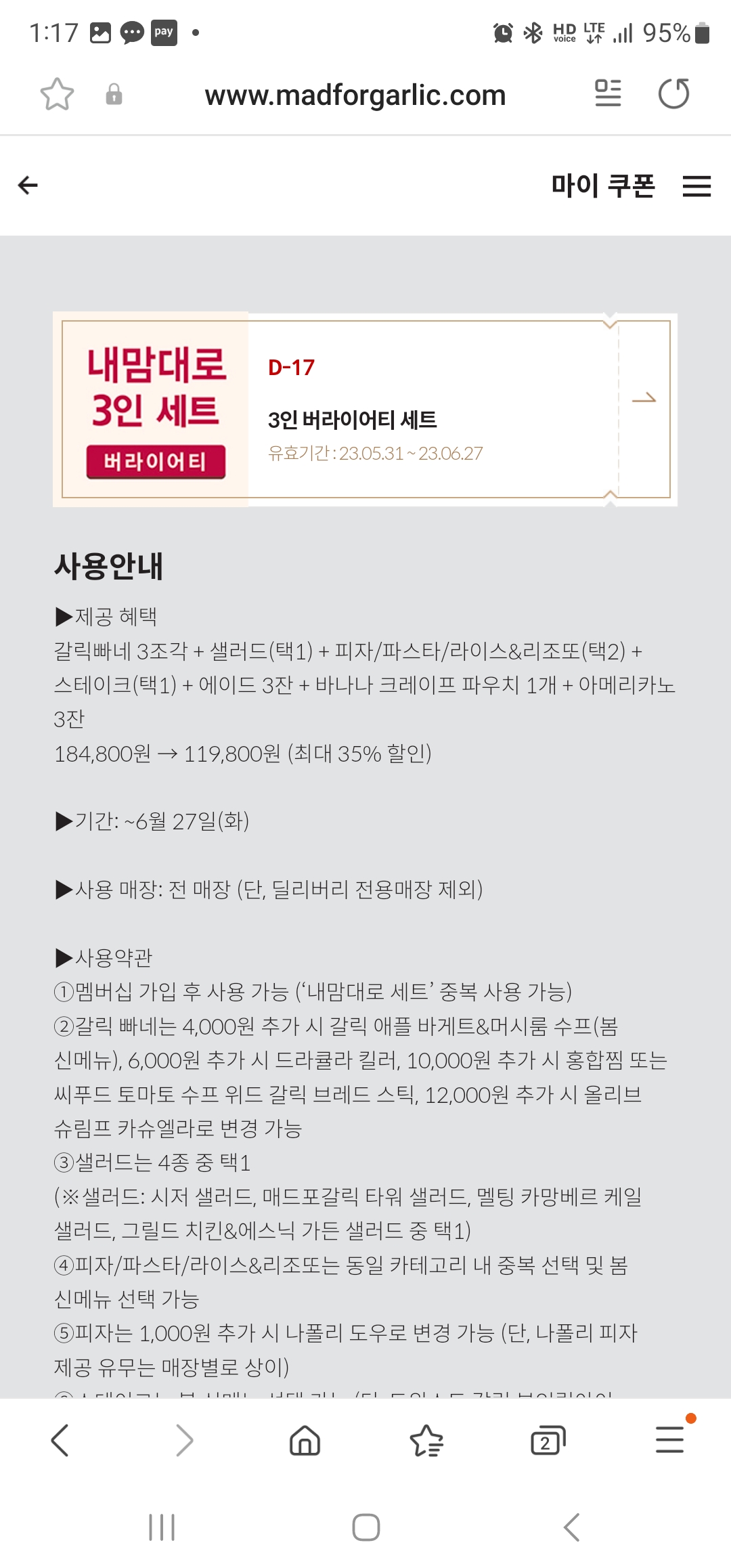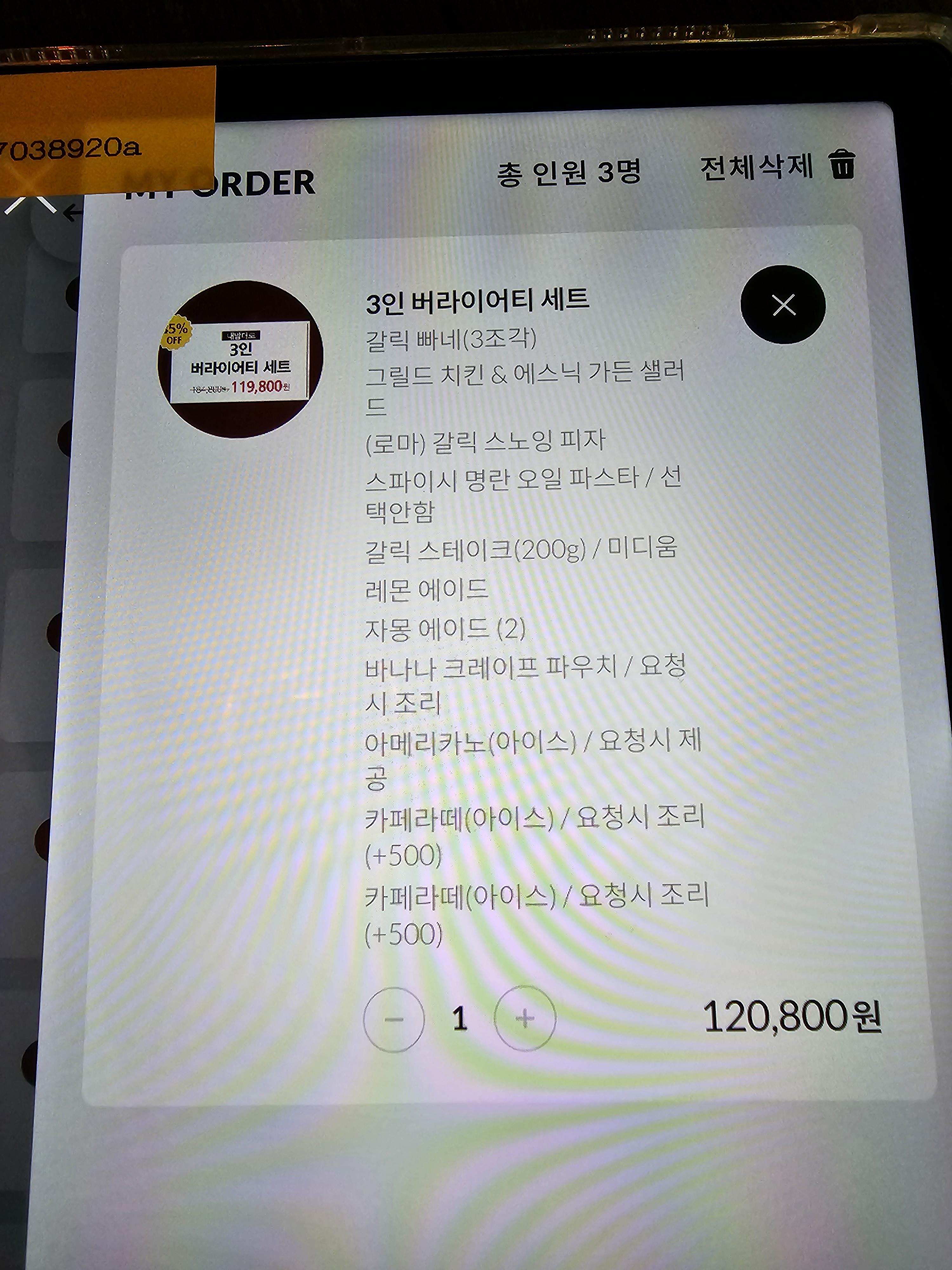 쿠폰은 매드포갈릭 사이트에서 확인할수 있었고, 주문은 테이블에 비치된 태블릿으로 주문을 했습니다. 3인 버라이어티 세트의 기본 구성은 갈릭빠네 3조각, 샐러드 1개, 피자와 파스타 그리고 리조또 중에 2개를 선택하고 스테이크 1개와 에이드 3잔 그리고 후식으로 바나나 크레이프 파우치 1개와 아메리카노 3잔으로 구성되어 있습니다. 주문을 선택할 때 취향에 따라 피자나 파스타 종류 및 샐러드도 고를 수 있는데 고르는 메뉴에 따라 추가금이 붙기도 하는 것 같습니다.