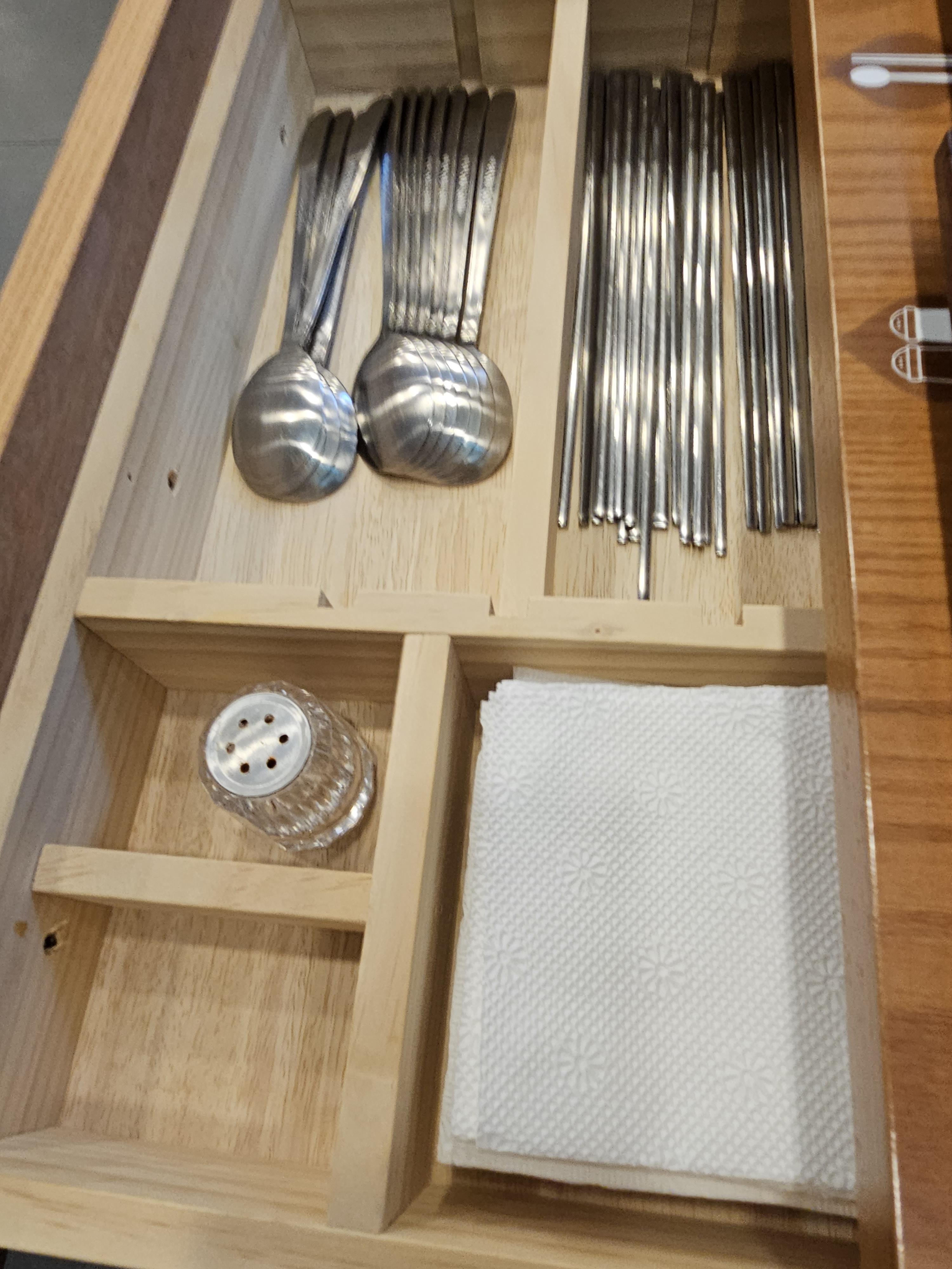포크와 수저, 고추가루, 티슈는 테이블 옆 서랍에 들어가 있습니다.