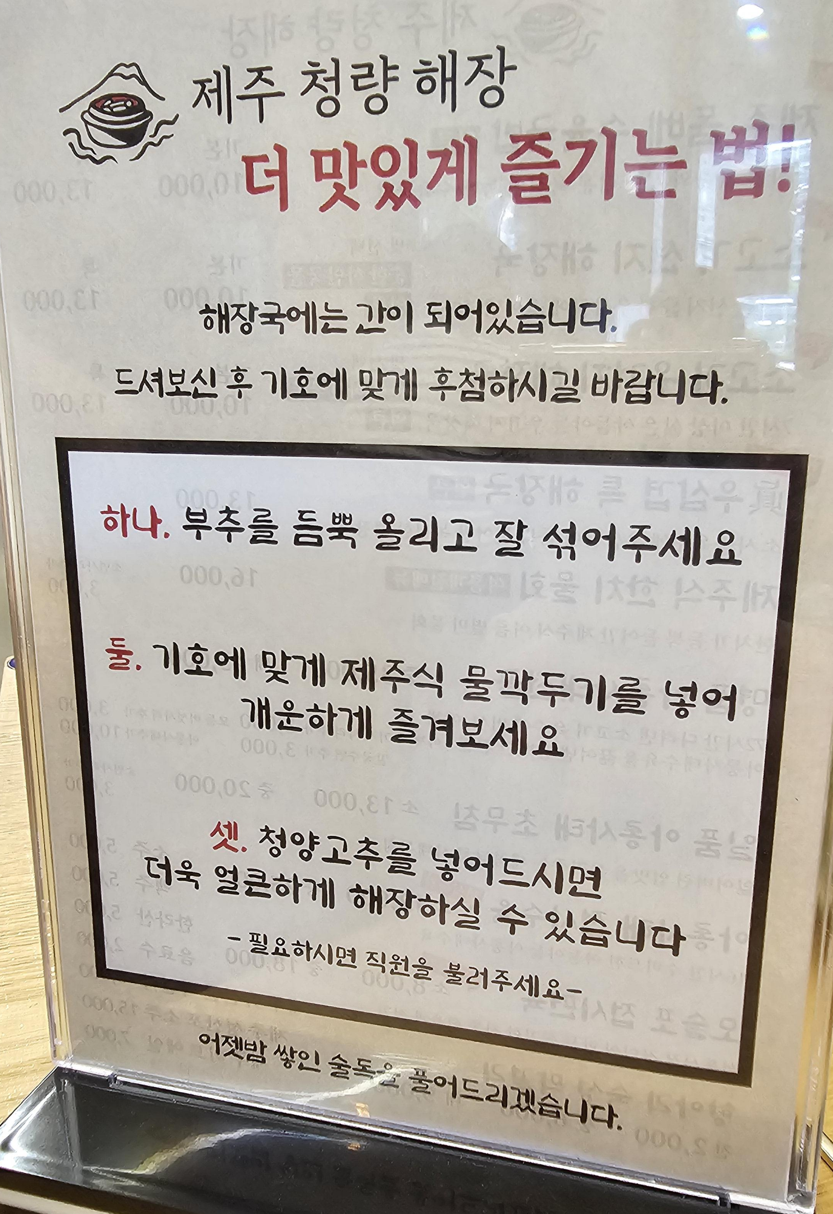 메뉴판의 뒷면에는 해장국을 더 맛있게 먹는 법이 적혀있네요.