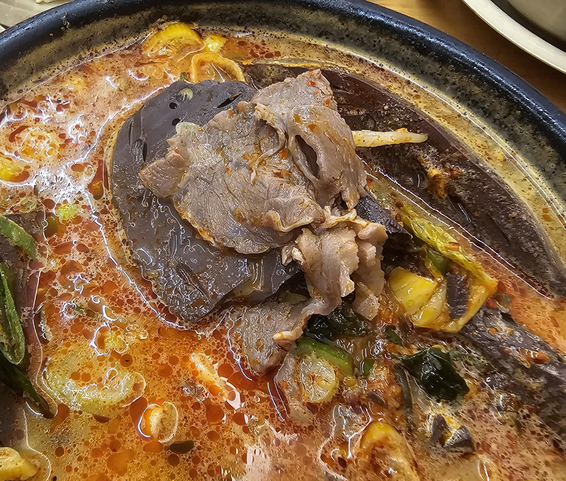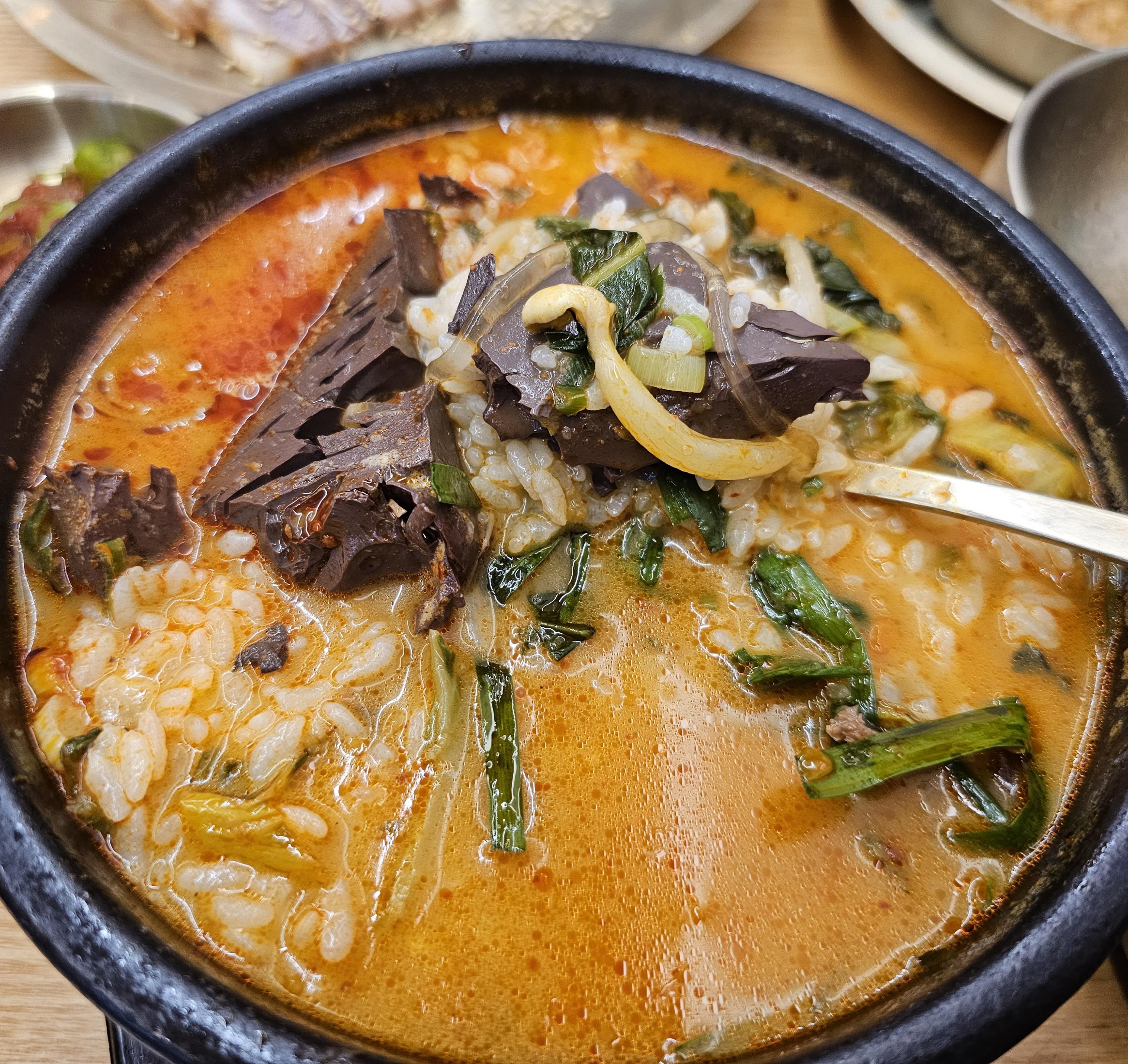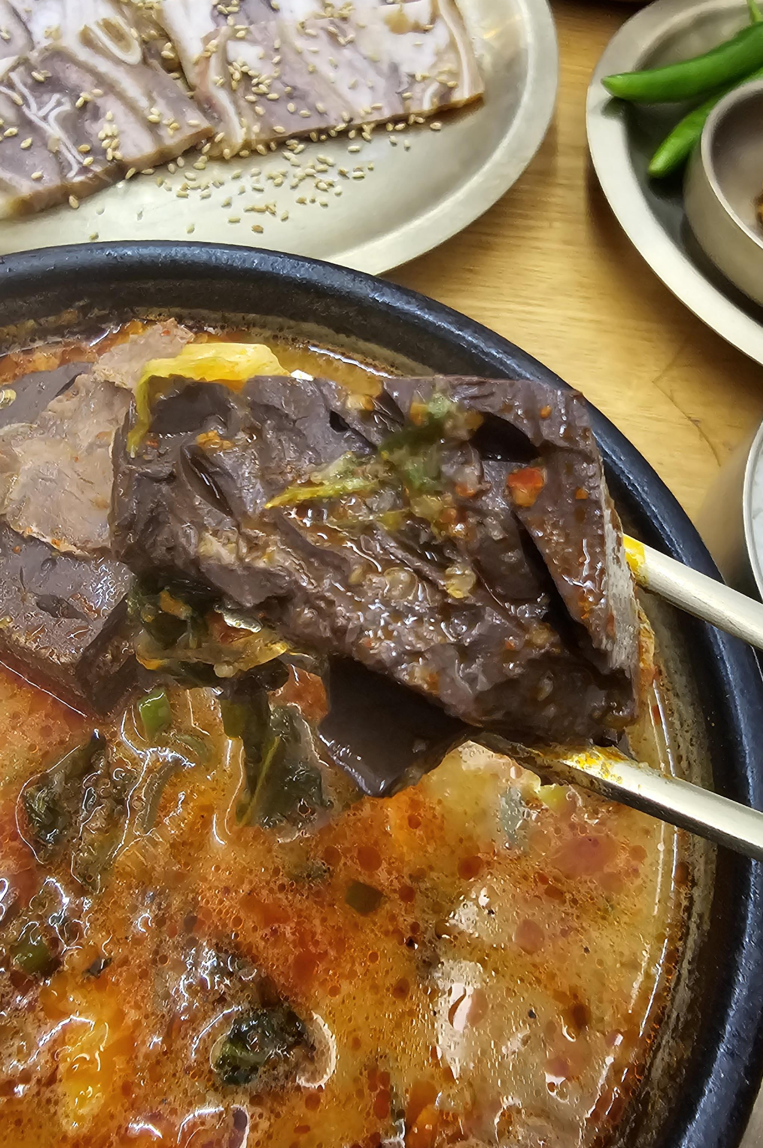 선지는 근래 먹었던 선지 중에 가장 깔끔하고 맛있었던 것 같습니다. 외관도 깨끗하고 맛도 잡내 없이 고소하고 깔끔하게 맛있었습니다. 다만 약간 뼛가루 같은 게 선지에서 조금 씹힐 때도 있더군요. 선지 개수도 어느 정도 덩어리로 4~5덩어리가 들어가 있는 것 같았습니다.