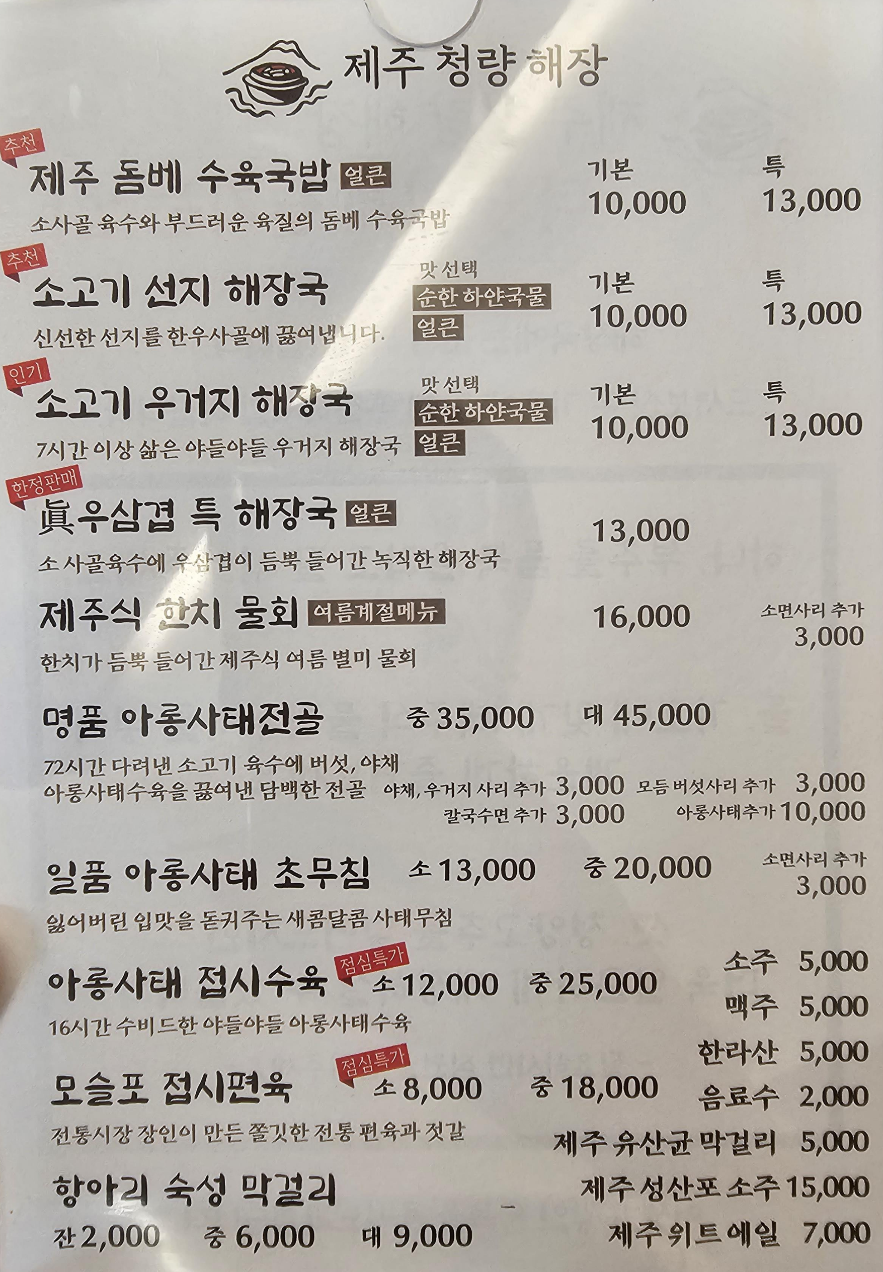 메뉴는 수육국밥과 해장국을 팔고 물회도 파네요. 저는 제주도 해장국 하면 생각나는 선지해장국을 먹으려 왔는데 마침 벽에 점심특가라고 소고기선지해장국 2개와 모슬포 편육 소를 세트로 25,000원에 파는 메뉴가 있어서 바로 주문했습니다.