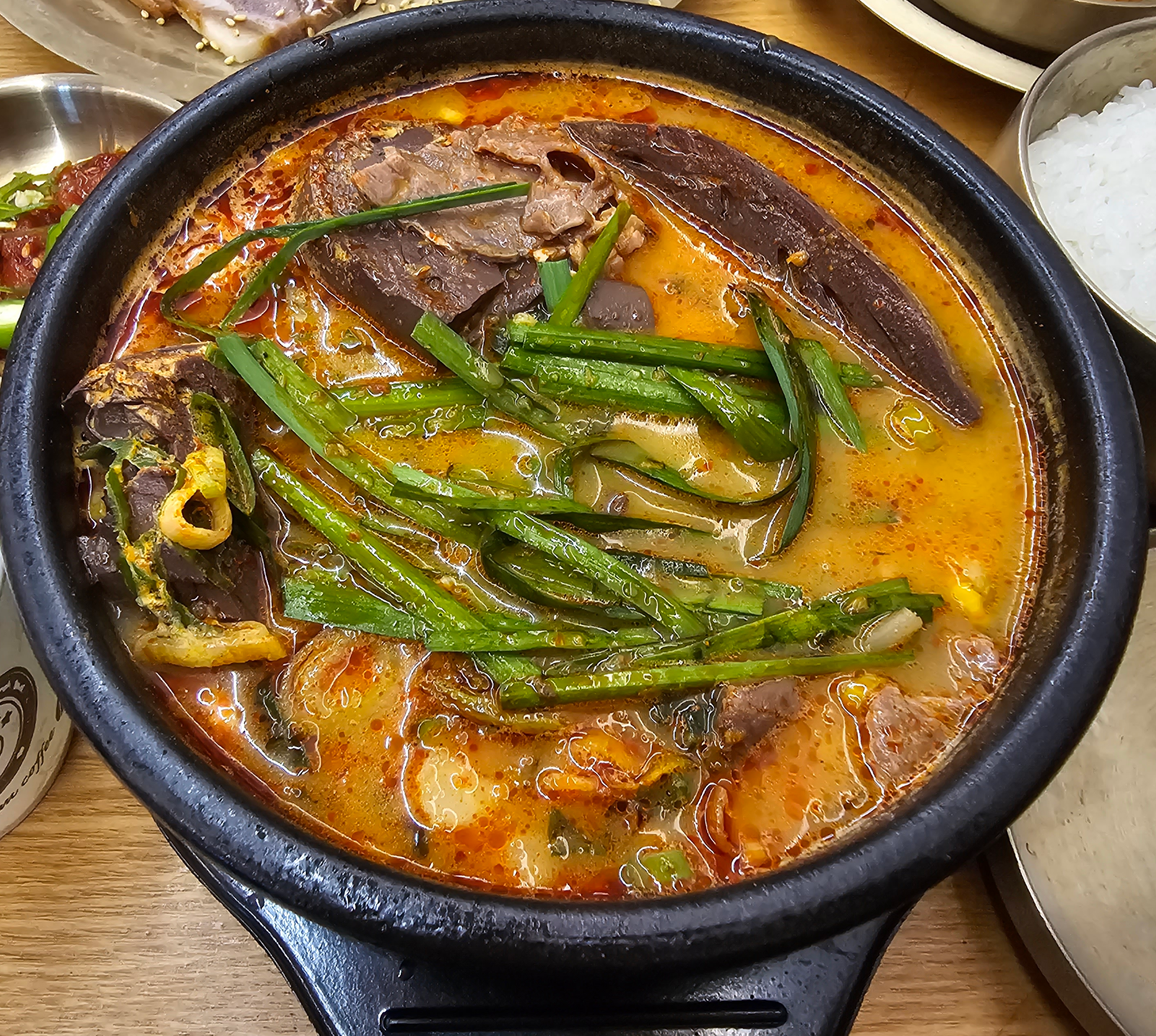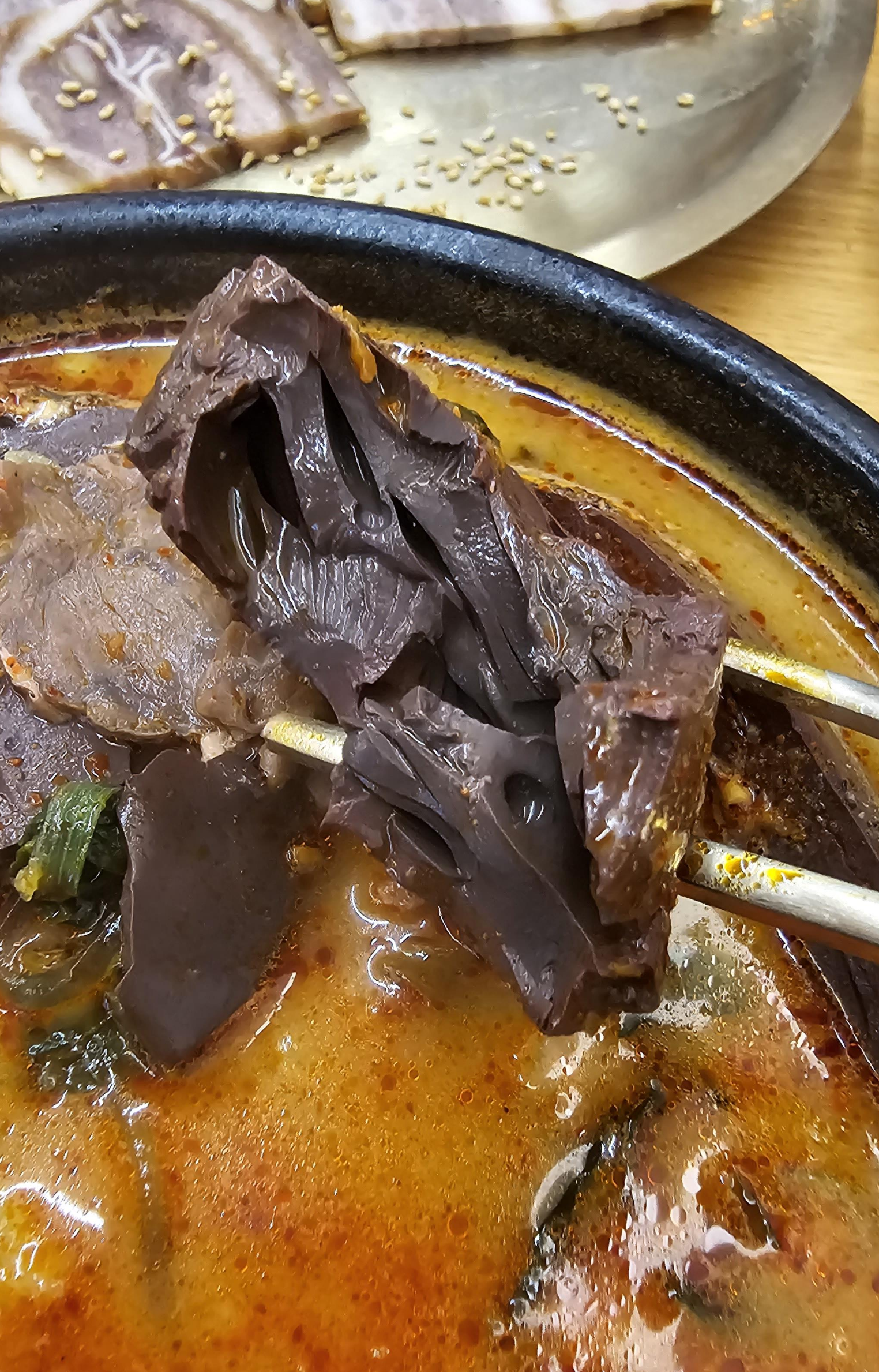 선지는 근래 먹었던 선지 중에 가장 깔끔하고 맛있었던 것 같습니다. 외관도 깨끗하고 맛도 잡내 없이 고소하고 깔끔하게 맛있었습니다. 다만 약간 뼛가루 같은 게 선지에서 조금 씹힐 때도 있더군요. 선지 개수도 어느 정도 덩어리로 4~5덩어리가 들어가 있는 것 같았습니다.