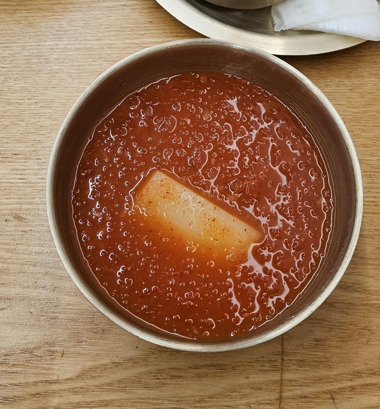 메뉴판의 뒷면에는 해장국을 더 맛있게 먹는 법이 나와있었습니다. 썰어져 있는 청양고추는 반찬으로 안 나왔는데, 셀프코너에 따로 있어서 매운 걸 좋아하는 분은 따로 가져다 먹으면 될 것 같습니다. 개인적으론 청양고추를 넣으니 더 맛있었던 것 같습니다. 그리고 반찬으론 김치와, 고추, 양파, 된장 그리고 해장국에 넣을 부추가 나옵니다. 또 따로 물김치가 나오는데 설명을 보니 제주식 물깍두기라고 하는 것 같네요. 새콤 매콤하고 시원해서 맛있었습니다. 무는 살짝 가장자리 부분이라 그런지 질긴 느낌이 있었습니다. 물깍두기를 넣어서 먹어도 맛있다고 하는데 전 따로 먹는 게 더 좋은 것 같아서 그냥 먹었습니다.
