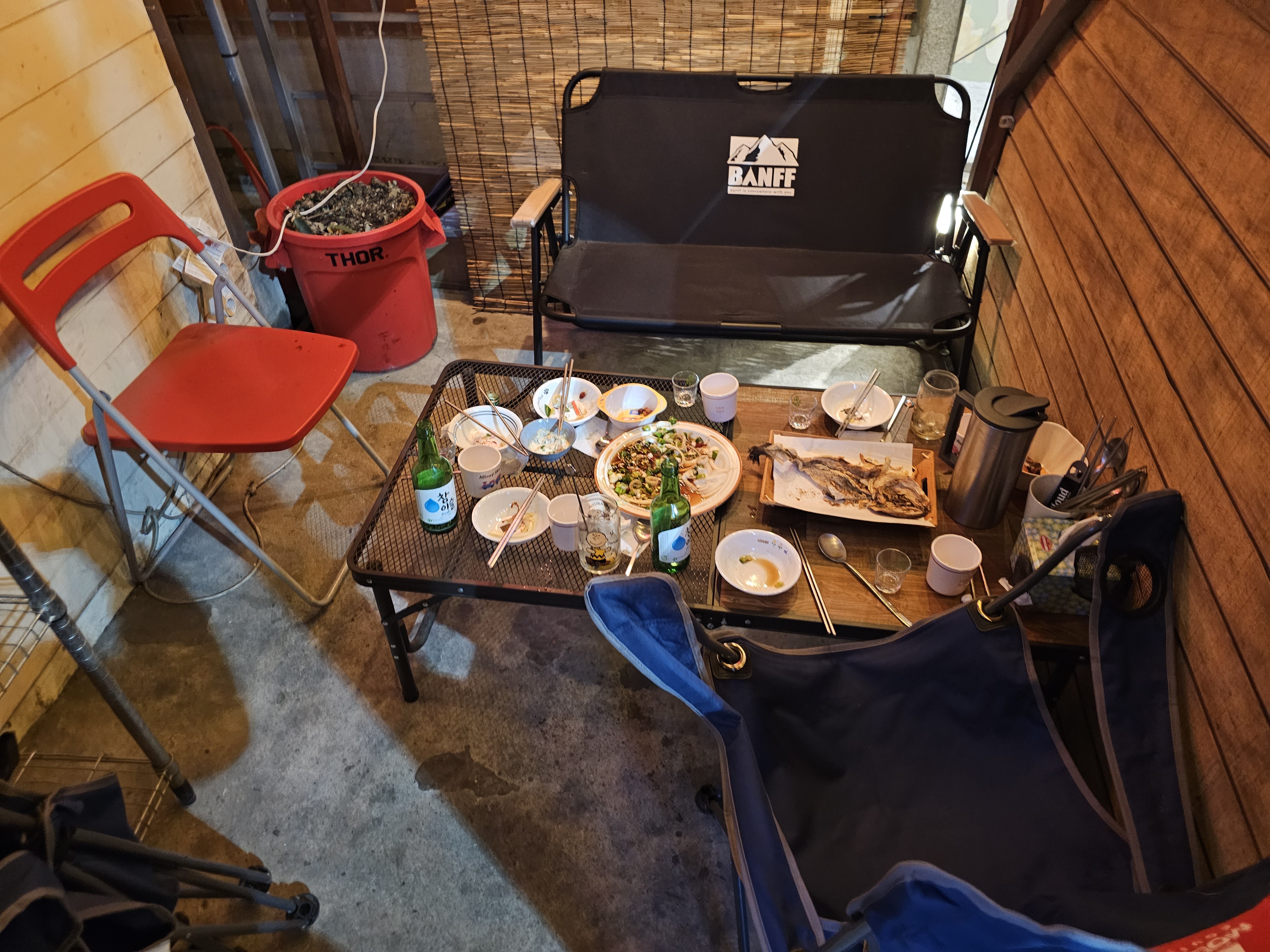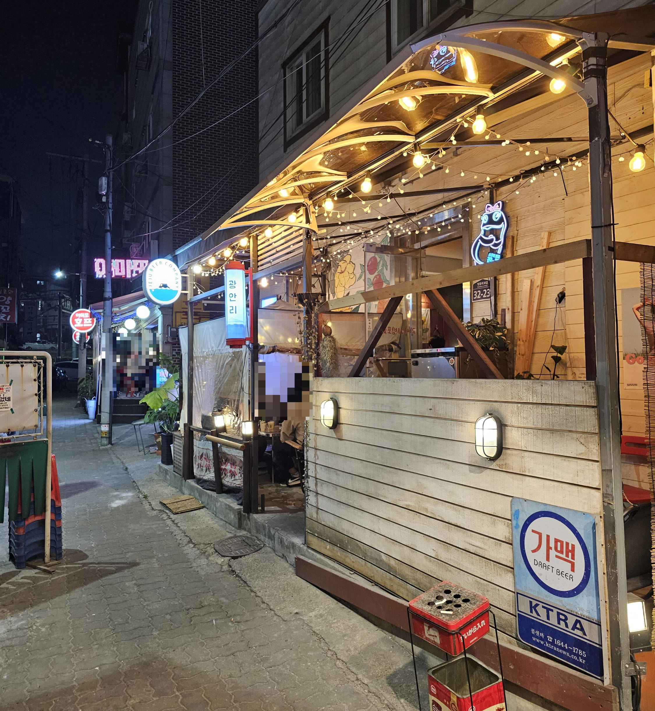 테이블은 내부에도 있지만 밖에도 캠핑? 스타일의 좌석이 있습니다. 분위기가 괜찮은 것 같습니다. 다만 골목의 야외라서 그런지 벽너머로 흡연하는 분들이 계실 때가 있어서 담배연기가 간혹 넘어오는 건 괴롭더군요.