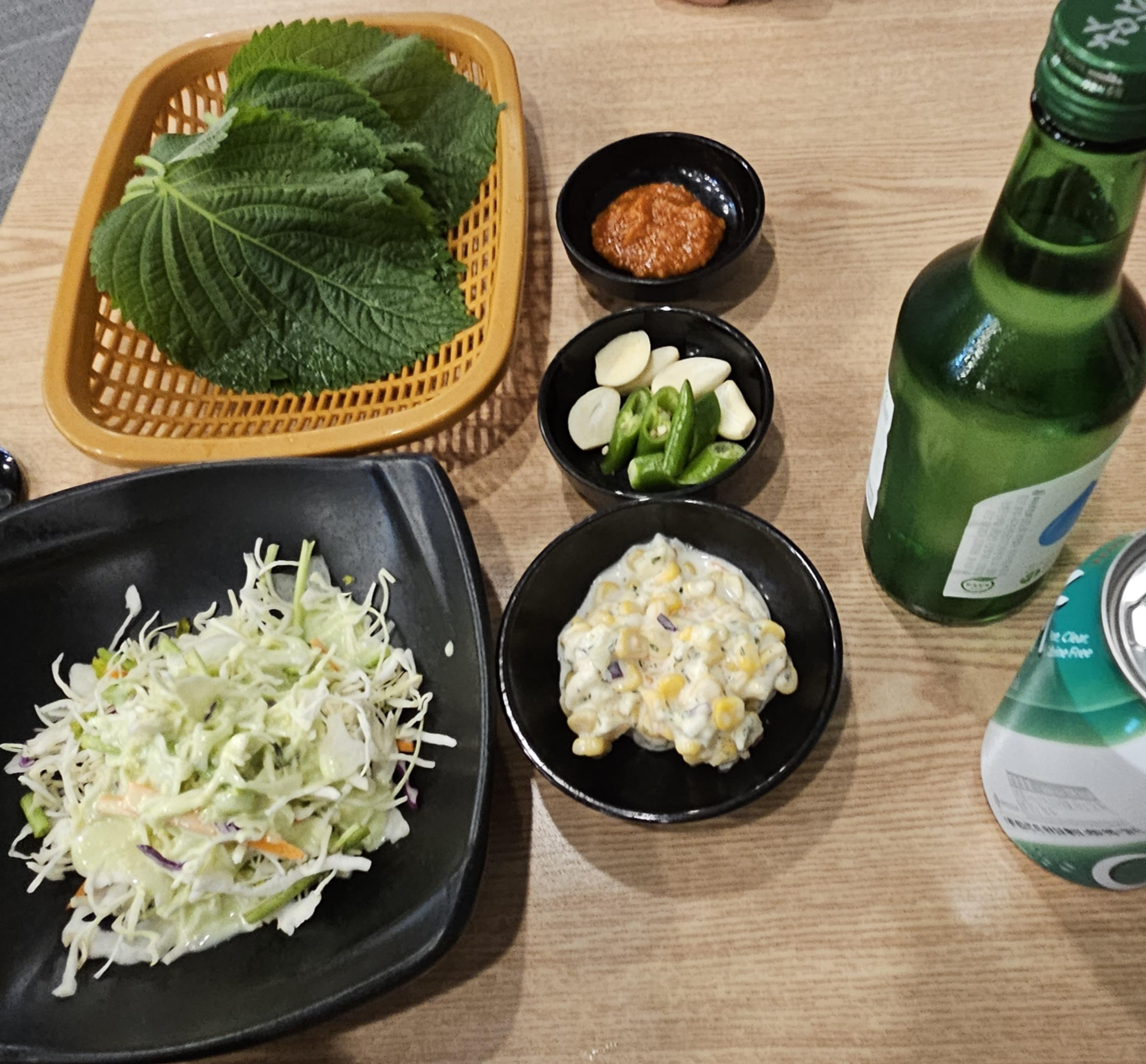 반찬으로 샐러드와 옥수수마카로니 샐러드 그리고 고추, 마늘, 쌈장과 깻잎이 나옵니다.