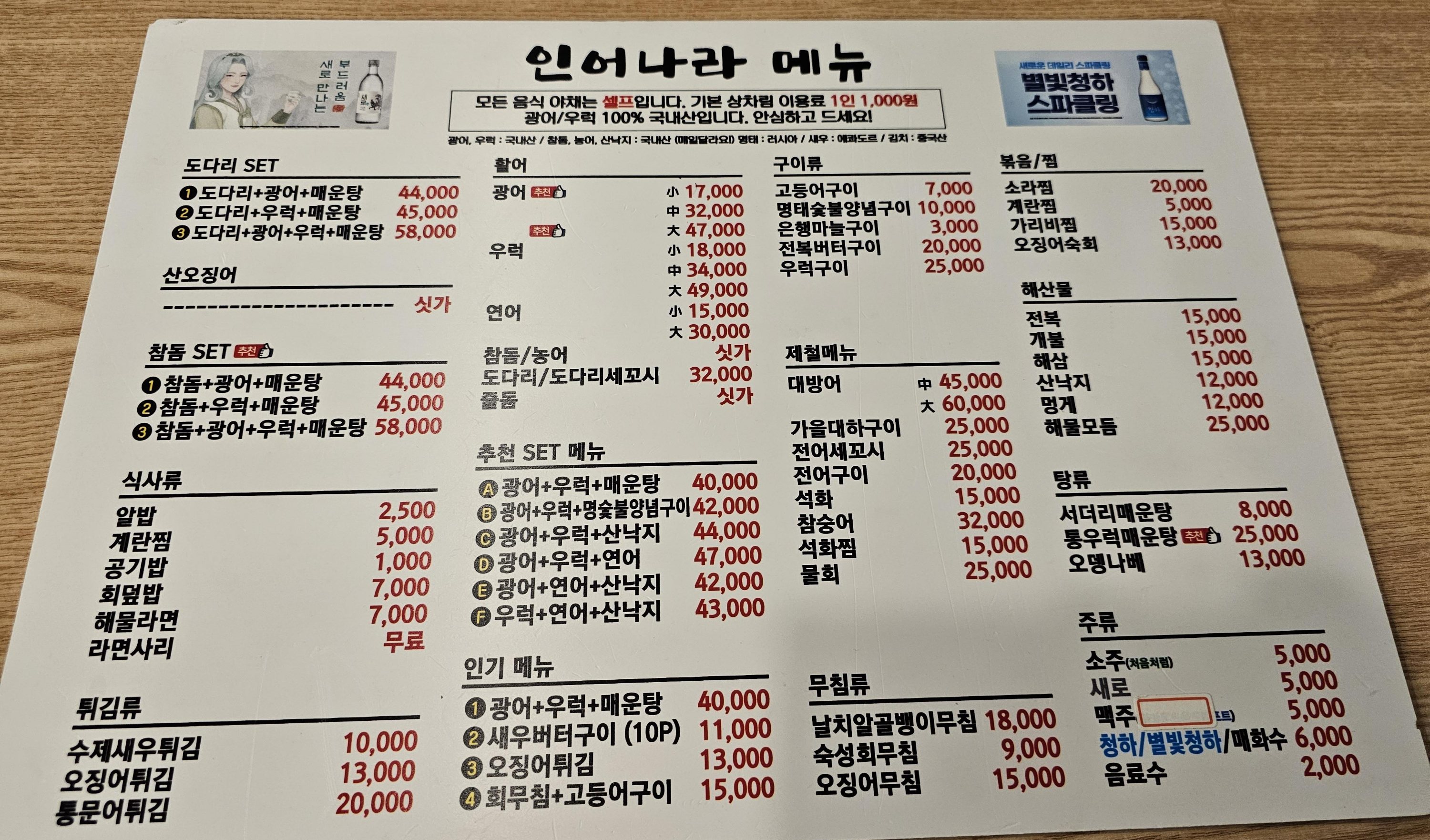 저녁을 안 먹었다면 매운탕과 회를 주문하면서 고등어구이도 같이 먹었을 것 같은데, 오늘은 2차로 갔기 때문에 가볍게 주문했습니다. 광어 소(17,000)에 소주(5,000원)를 주문했습니다. 그리고 상차림비용이 1인당 1,000원이라 2명 2,000원이 나갔네요.