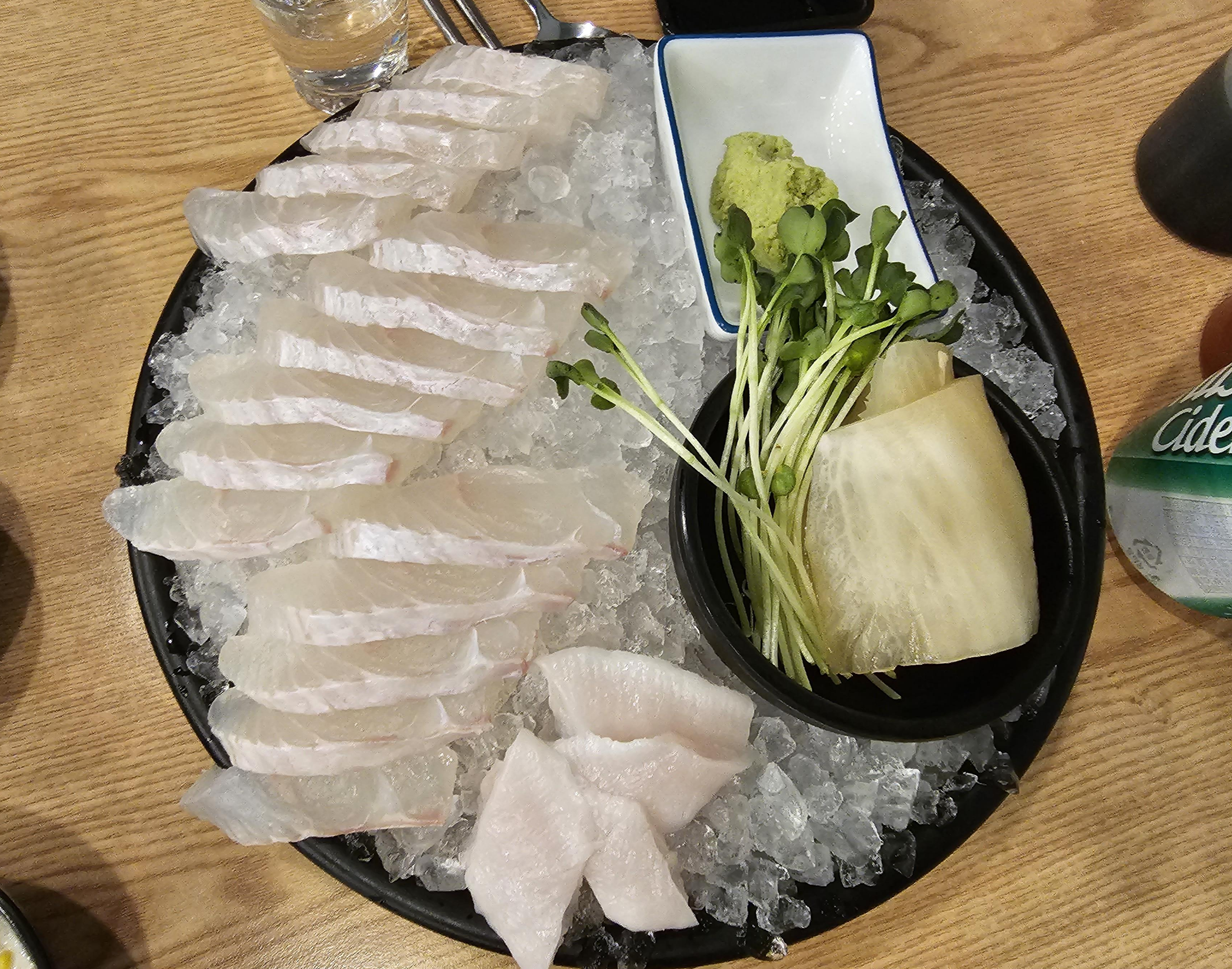 고추냉이와 무순, 백김치가 함께 나오고 광어도 조금이지만 지느러미 부분도 나오네요. 광어도 얼음 위에 있어서 그런지 더 쫄깃한 기분이었습니다. 양은 적지만 2명이 깔끔하게 먹기 좋아서 소규모 2차로 먹기 오기 좋은 식당인 것 같네요.