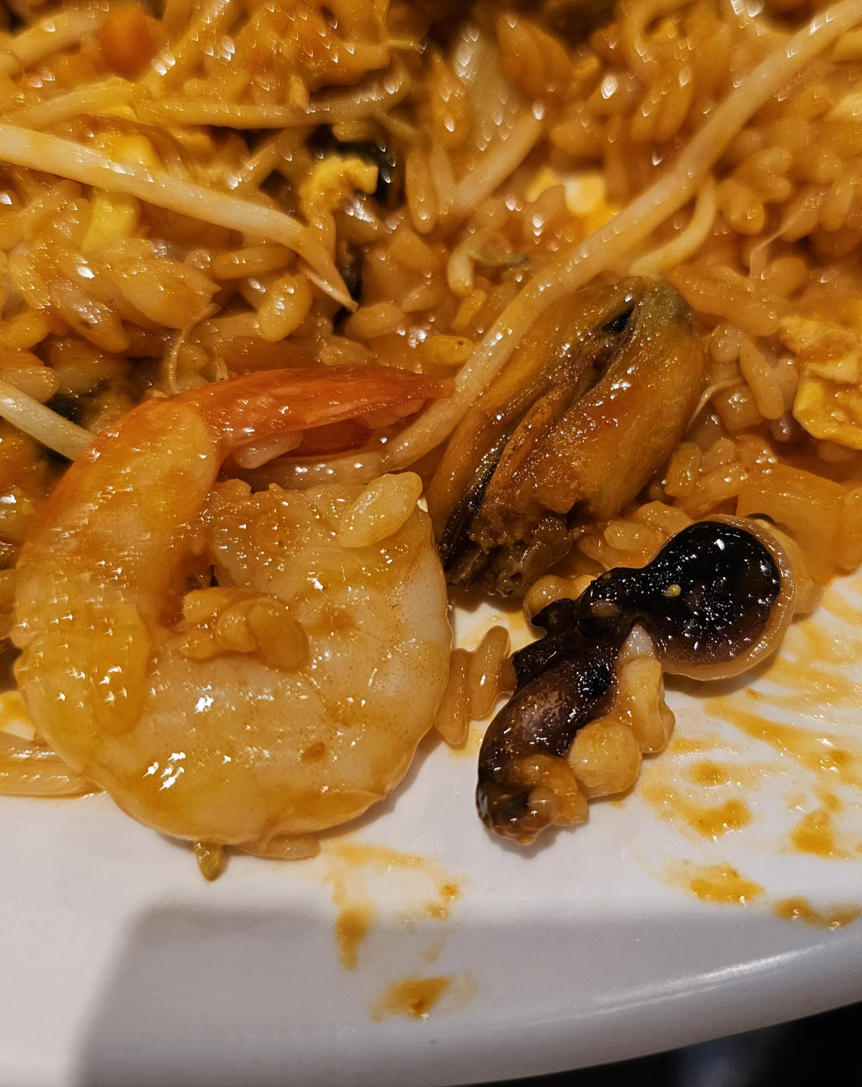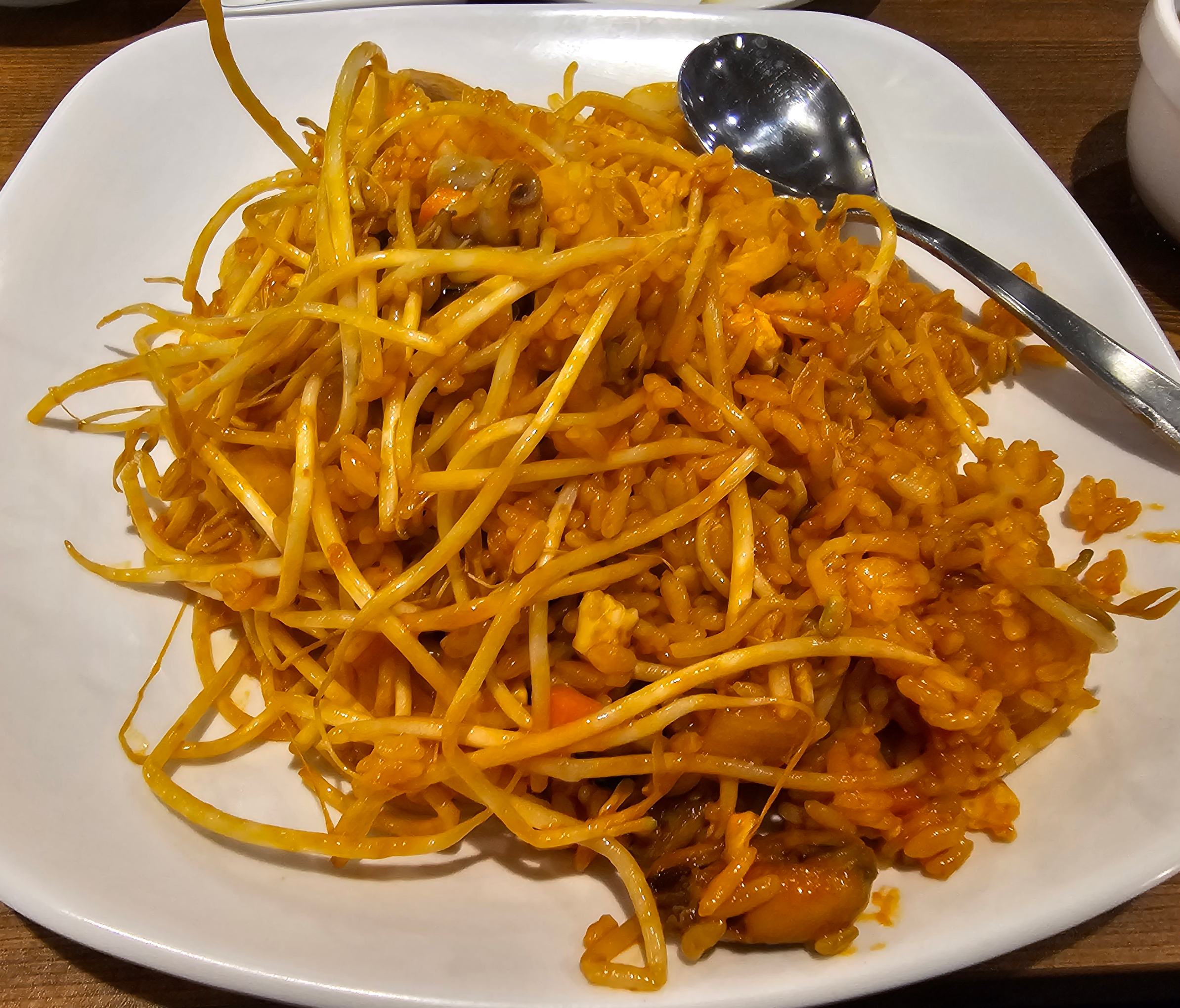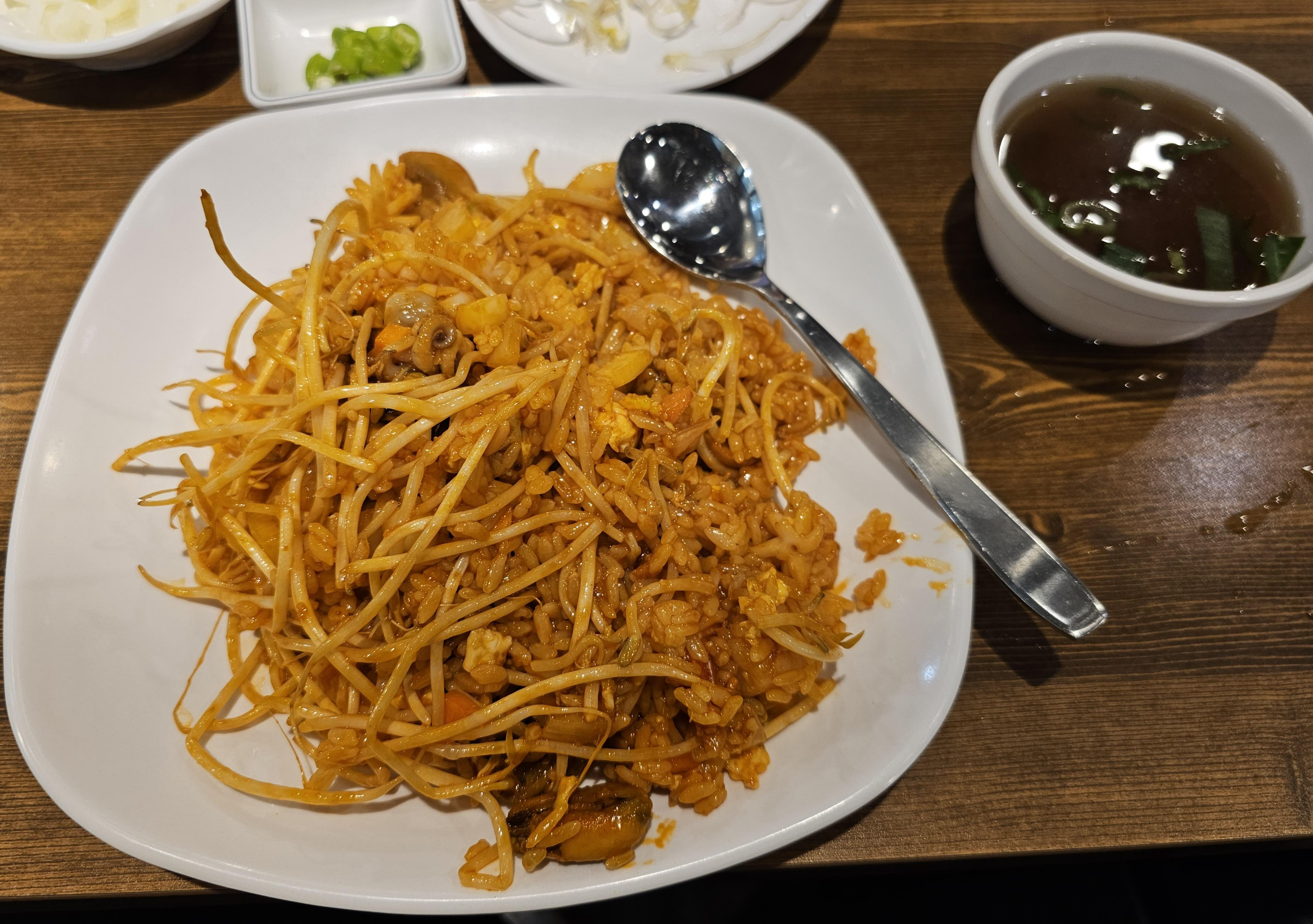 칠리볶음밥은 이름답게 붉은색의 볶음밥이였습니다. 쌀국수 국물과 함께 나왔고, 볶음밥에는 해물과 숙주가 들어가 잇네요.