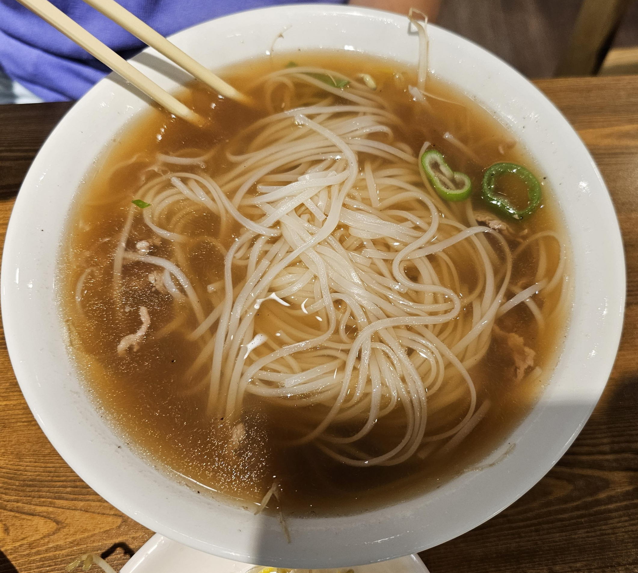안심쌀국수는 저는 이번이 처음 본건데 음식이 나올 때 보니 고기를 따로 생으로 접시에 넣은 다음 뜨거운 국물을 부어서 샤부샤부 같은 느낌으로 고기를 익히는 방식으로 조리를 하시더군요. 그래서 나온 음식도 처음엔 쌀국수 면과 국물만 보였는데 면을 뒤집어 보니 아래에 고기가 있었습니다. 면도 일반적인 쌀국숫집에서 먹던 평범한 맛이었고, 국물도 짭짤하고 맛있었습니다.