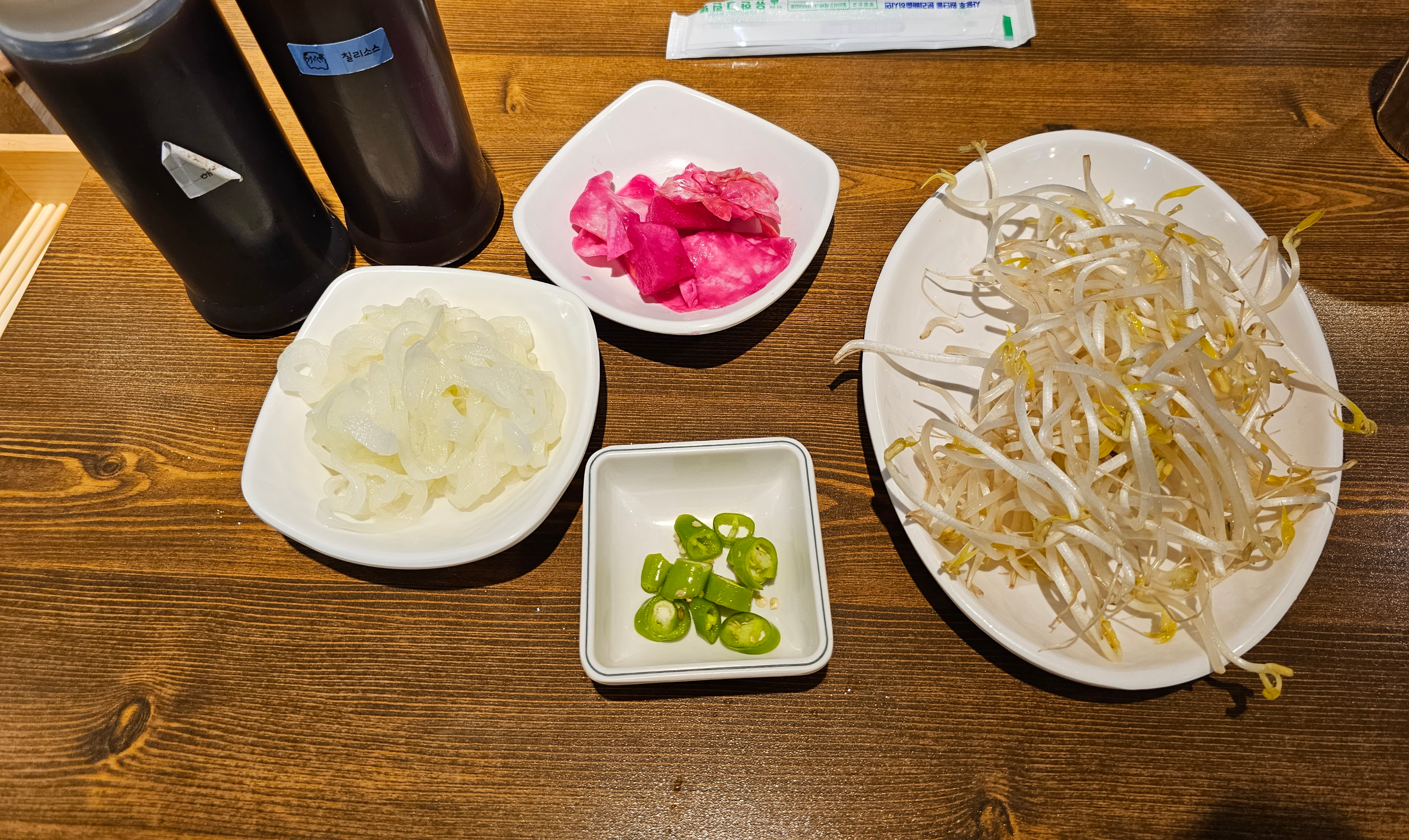 쌀국수에 추가해 먹을 생 숙주나물과 고추 그리고 양배추 피클과 양파절임이 반찬으로 나왔습니다.