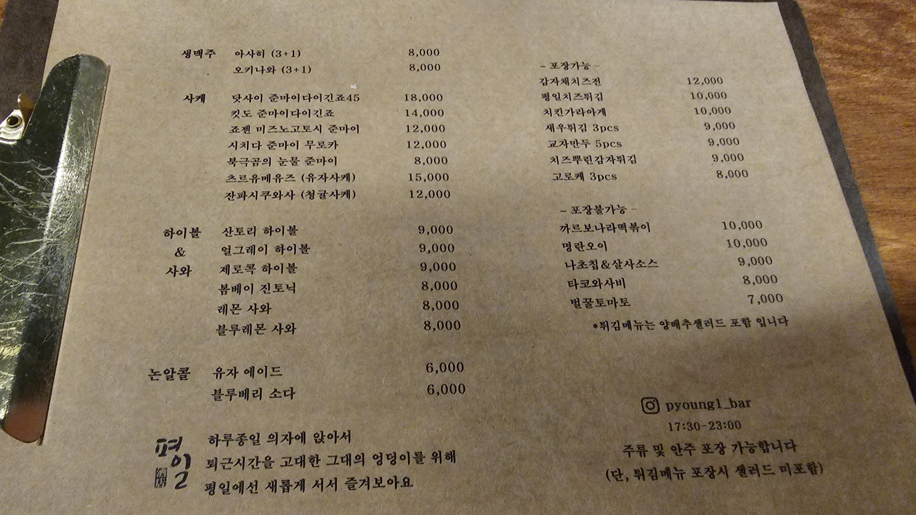 메뉴는 다양한 하이볼과 사케, 맥주를 팔고 안주는 혼자 먹기 편한 안주 위주로 팔고 있는것 같습니다.