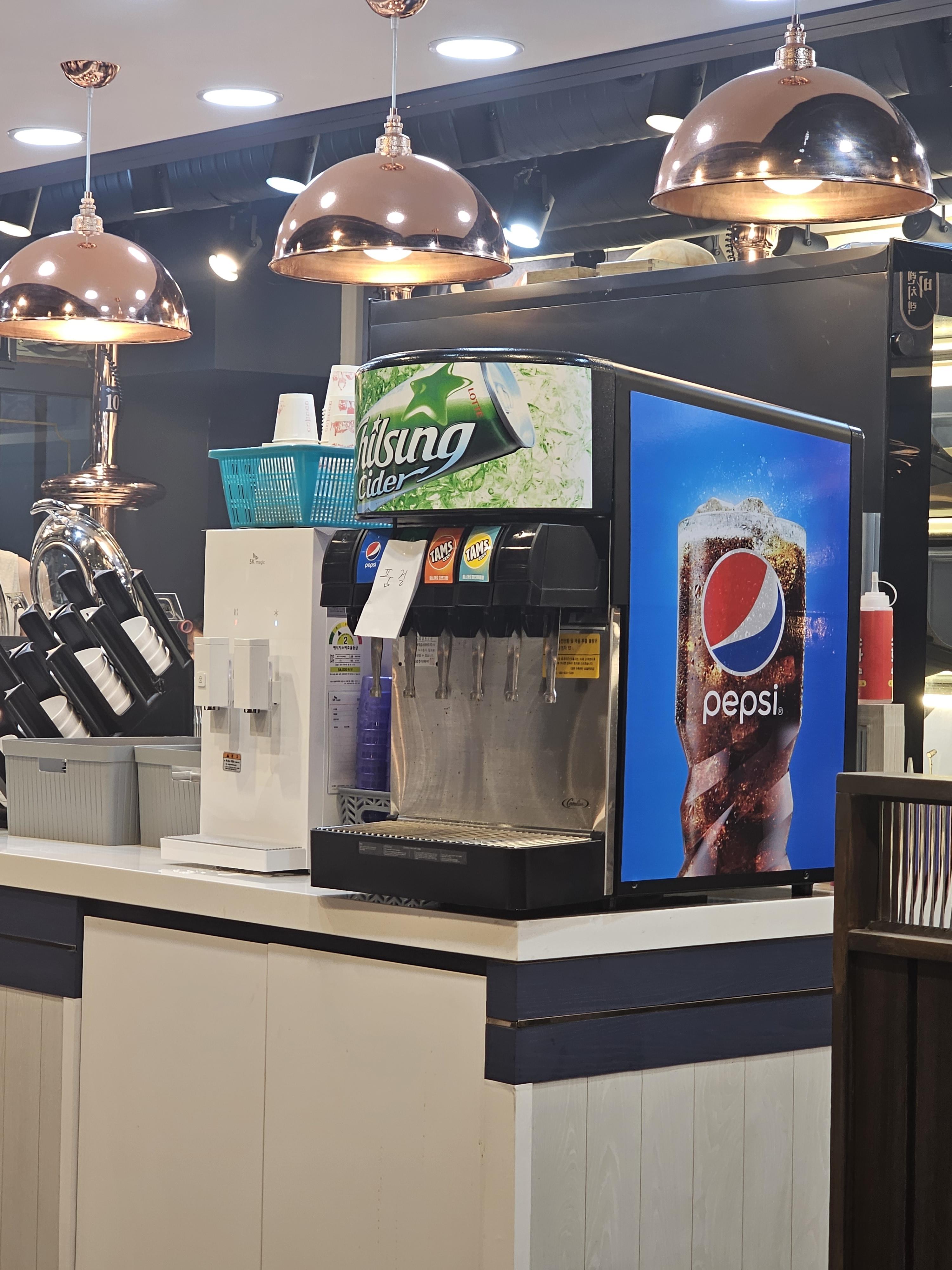 식당 가운데에는 음료수 디스펜서가 있는데 탐스 제로 파인애플, 탐스 제로 오렌지, 팹시가 있었습니다. 콜라는 약간 탄산이 빠진 느낌이라 탐스를 먹었습니다. 그리고 상추, 파채, 양파, 기타 반찬과 밥이 있었습니다. 요즘처럼 상추가 비쌀 때 상추를 양껏 먹을 수 있다는 점이 좋았습니다.