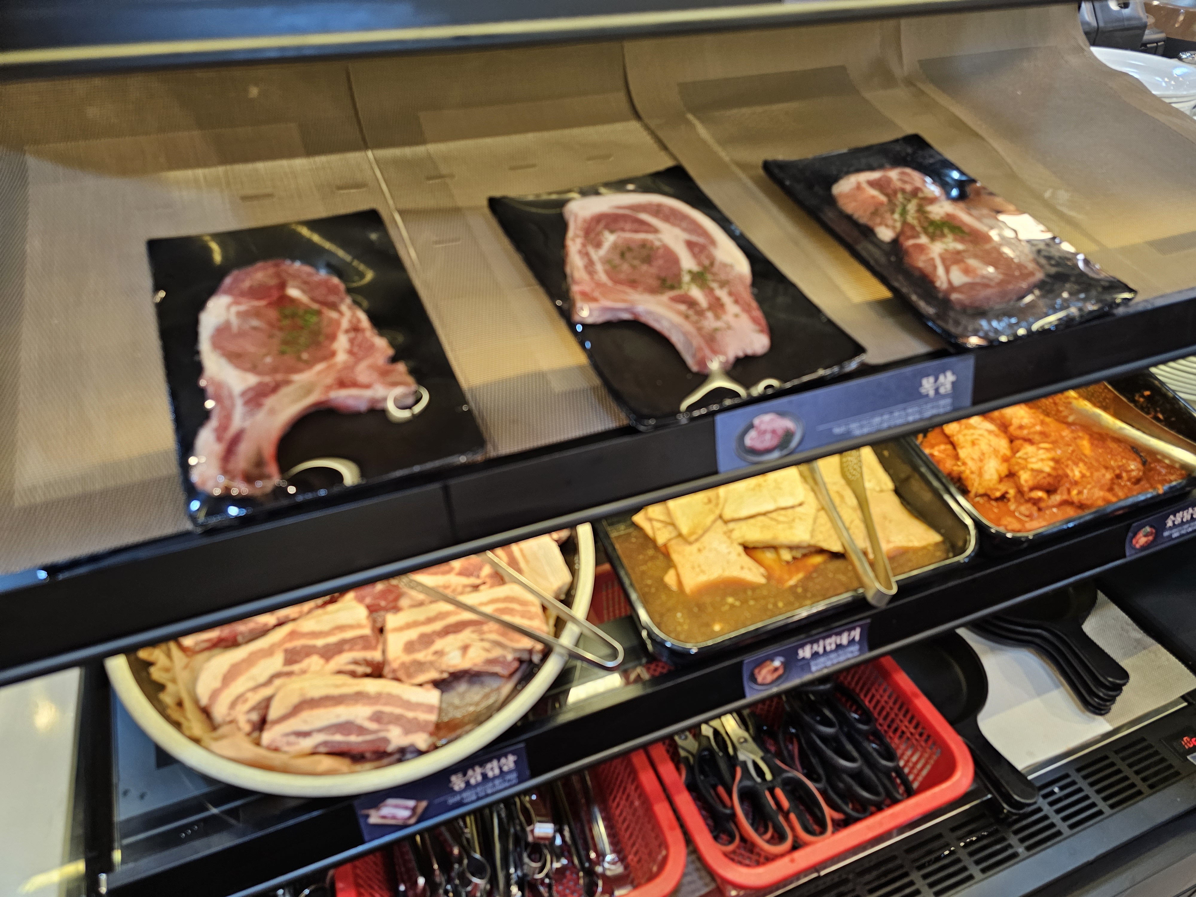 그 옆으론 고기들이있었는데, 양념갈비는 따로 가져다 달라고 하면 주는 방식이고, 이곳에는 삼겹살과 목살, 돼지껍질과 양념닭갈비가 있었습니다. 돼지만 먹다가 중간에 닭고기를 먹으니 덜 물리고 더 먹을 수 있었던 것 같네요.