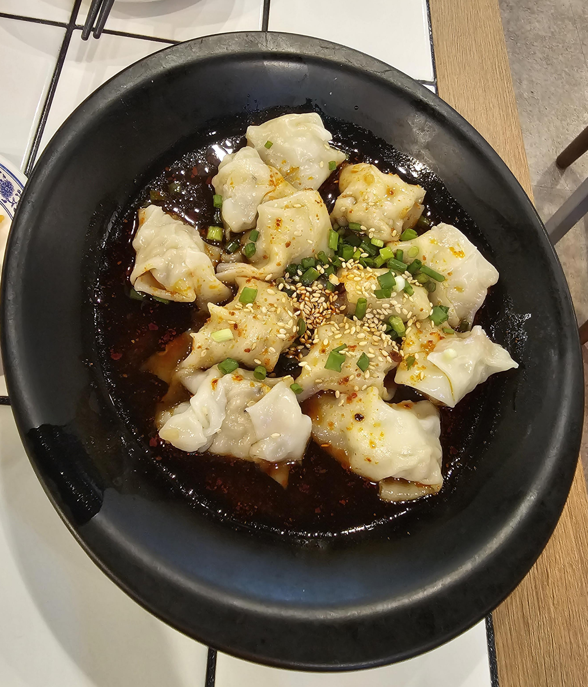 차오쇼우는 매콤 새콤한 중국식 물만두라고 합니다. 만두는 9,000원에 14개가 들어간다고 메뉴판에 표시되어 있었고, 먹을 땐 몰랐는데 나중에 먹다 보니 2개가 빠졌다고 따로 가져다주셨습니다. 지금 사진을 보니 처음 접시에는 12개가 있었네요.