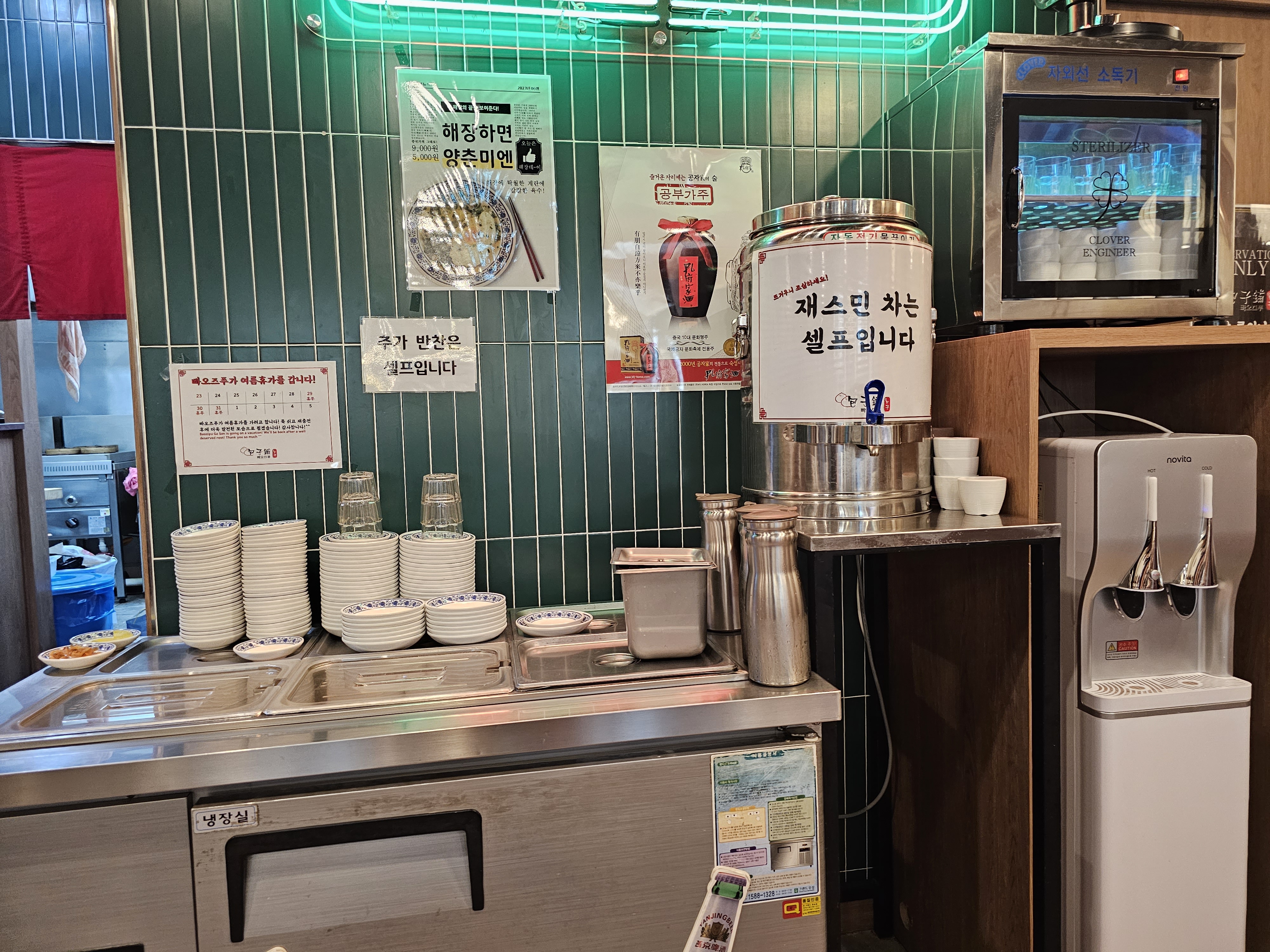반찬으론 단무지와 짜사이무침이 나오는데, 셀프코너에서 더 가져다 먹을 수 있고, 셀프코너에는 따뜻한 재스민 차도 있습니다.
