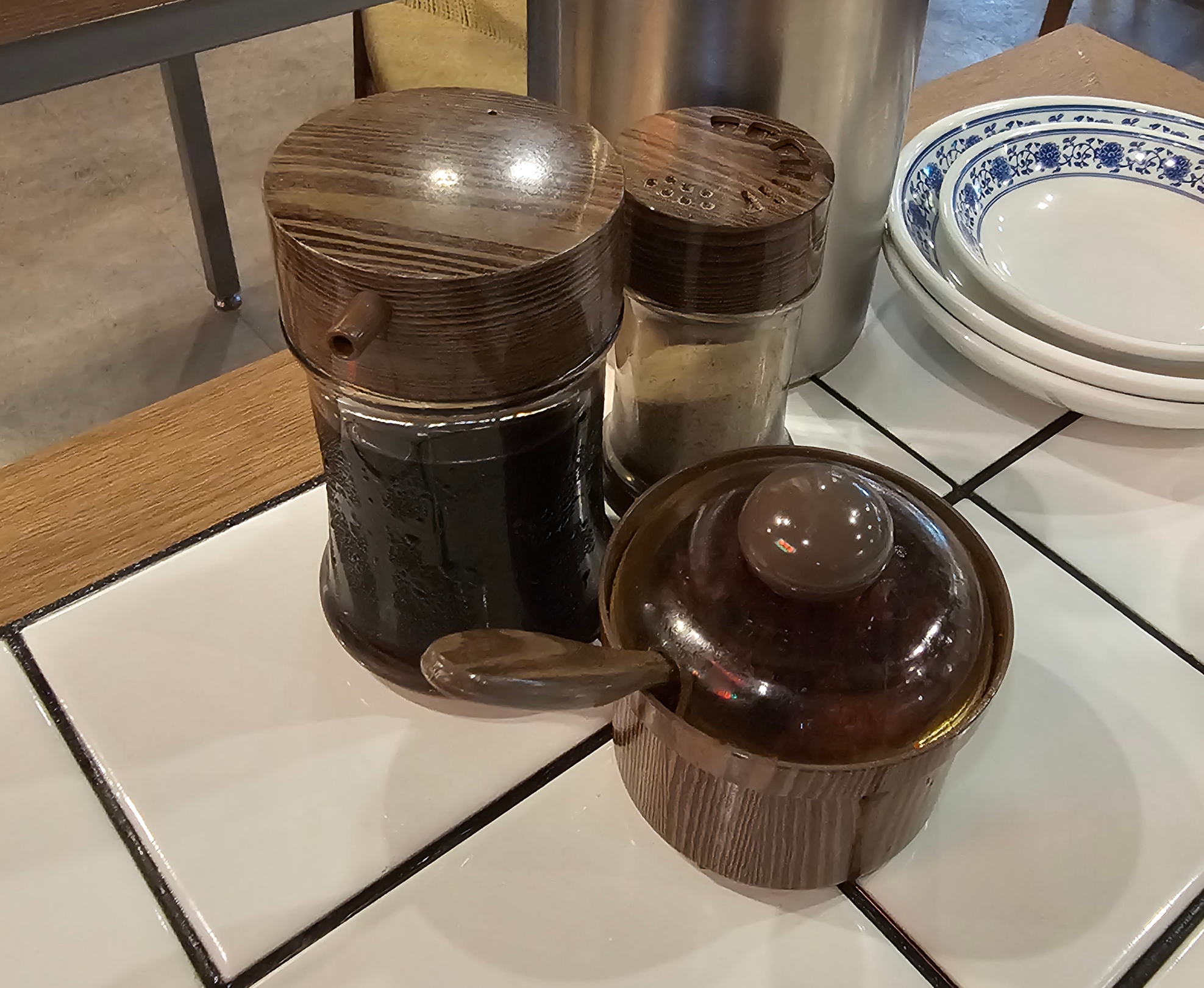 테이블에는 간장, 볶음고추 등이 있어서 취향껏 먹는데 쓸 수 있습니다.