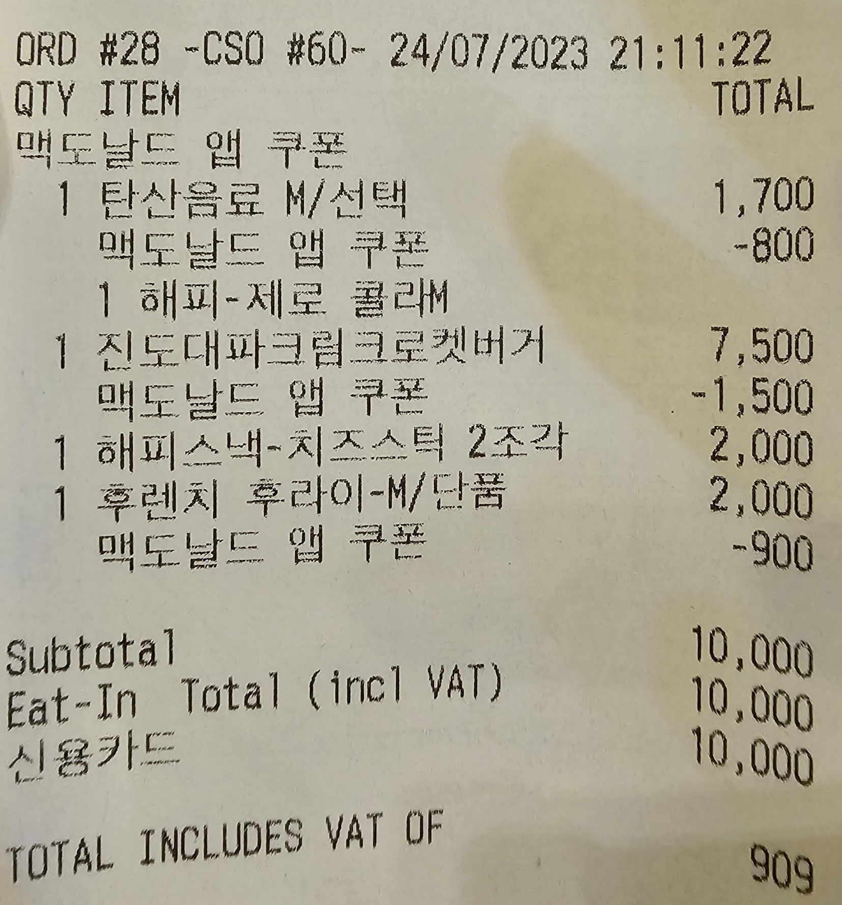 맥도날드 앱 쿠폰에 세트메뉴 8,000원으로 주문이 가능해서, 해피스낵 치즈스틱 2조각 2,000원과 함께 주문했습니다.