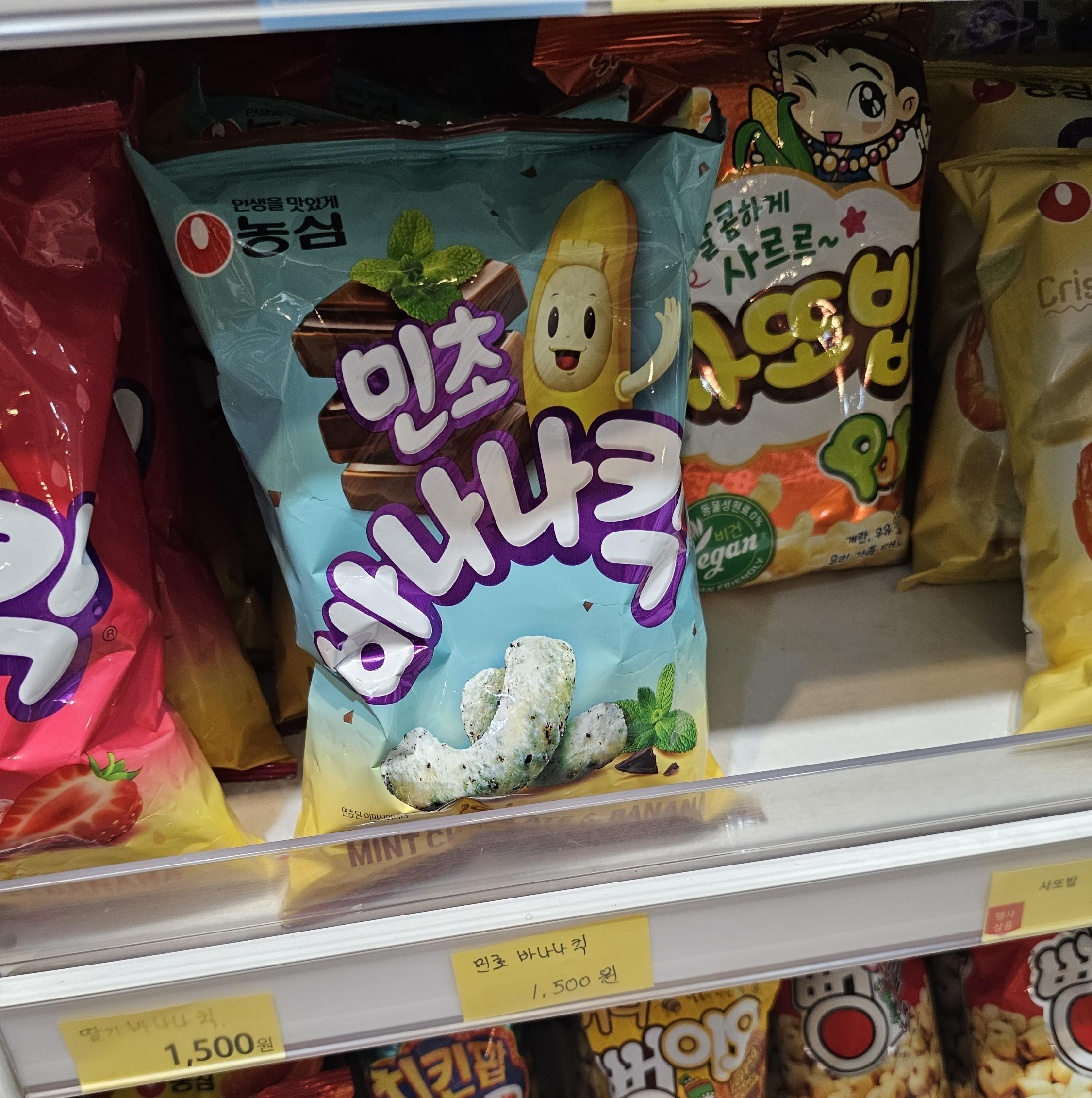 동네 무인편의점에서 마주친 녀석... 민초 바나나킥이라니... 얼마 전 옆에 있는 딸기 바나나킥([리뷰] 딸기 바나나킥 후기)을보고 어쩜 저런 녀석이?! 하면서 샀던 기억이 있는데 이 녀석은 딸기보다도 더 눈길을 사로잡았습니다. 가격은 1,500원이었습니다.
