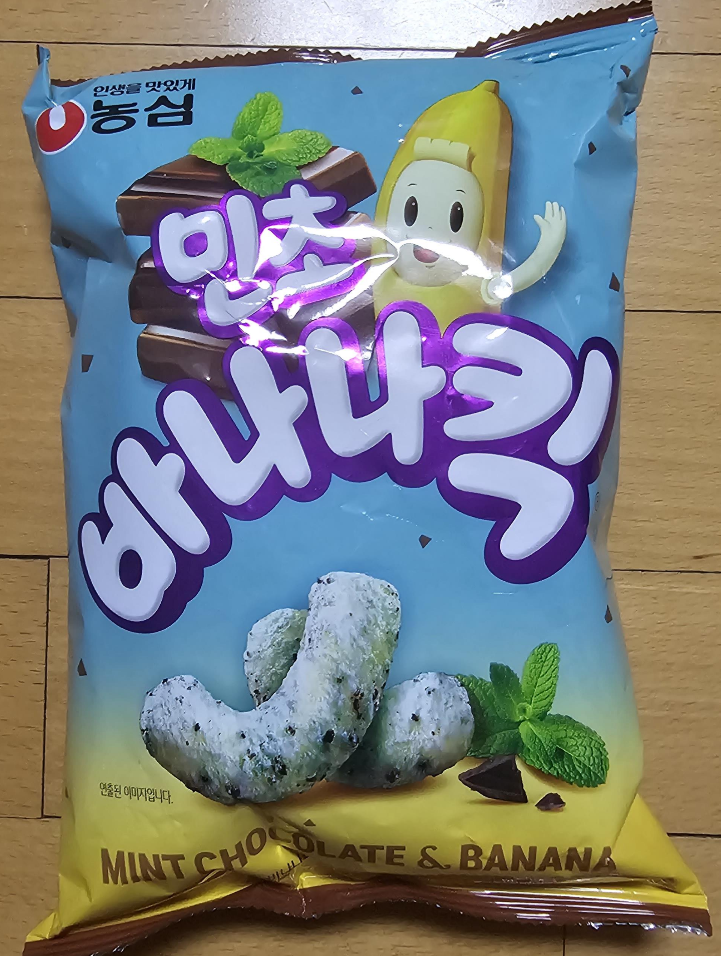포장지는 민초답게 민트색배경에 초콜릿, 민트, 바나나녀석이 손을 흔들고 있습니다. 연출된 이미지는 연출이 됬는데도 맛있어 보이지가 않네요. 이미 딸기 바나나킥으로 이 녀석들은 시즈닝만 바꾸고 이름 달고 나온다는 걸 배웠기 때문에 큰 기대는 안 하고 있었습니다.