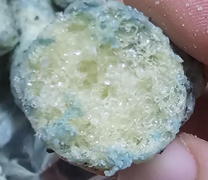 뚜껑을 열었을때 민트 냄새와 바나나킥의 냄새가 섞여서 맡아졌습니다. 바나나킥의 색상인 노란색과 민트색 그리고 초코인지 검정 점들이 섞인 외관이네요.