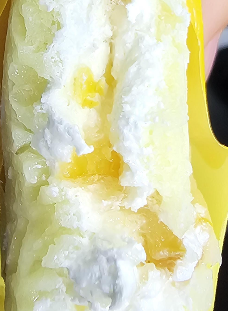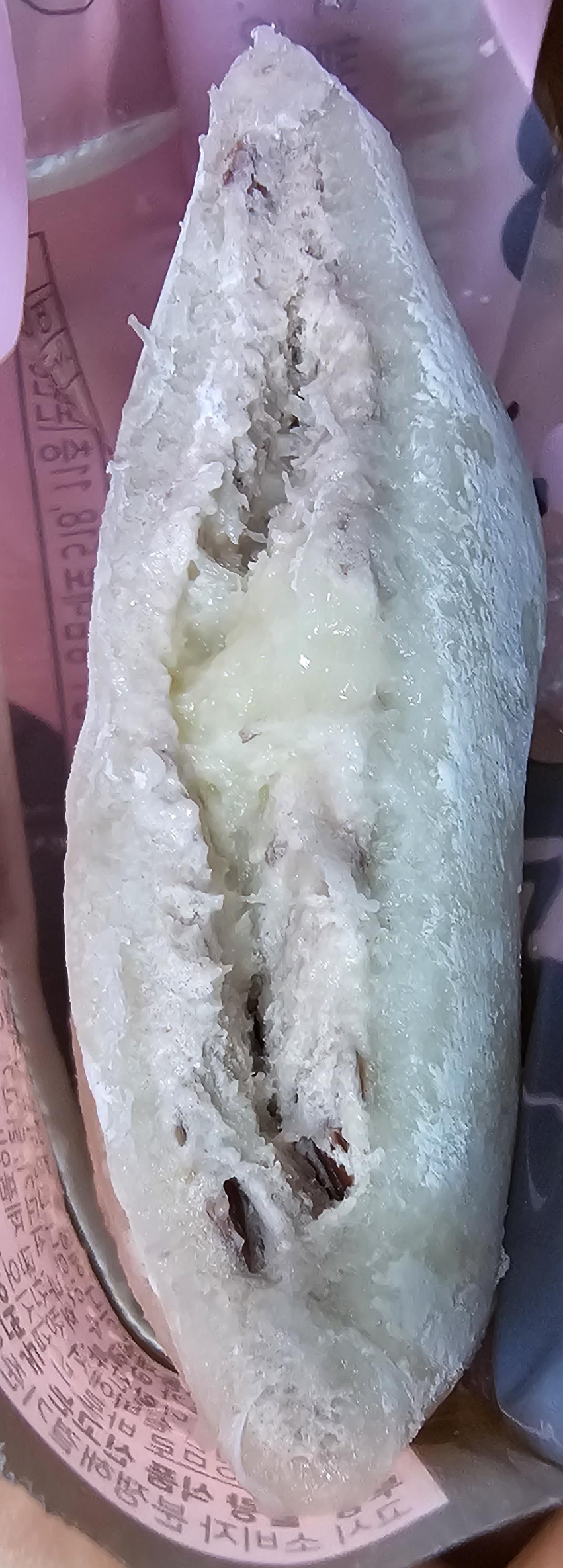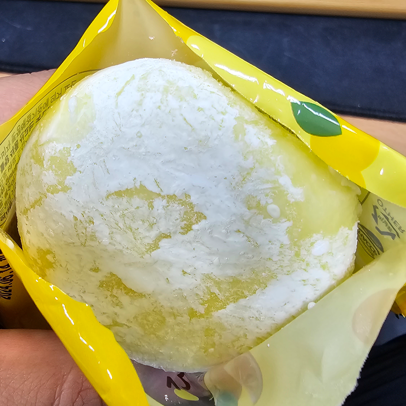 아이스와앙모찌 고흥유자맛은 팥빙수 맛처럼 찹쌀떡 느낌이 나는 외관이고 밀가루가 붙은 것도 동일했지만 겉 부분 떡의 색상이 노란색이었습니다. 그리고 내용물도 팥빙수 맛처럼 아이스크림이 아니고, 생크림? 이 들어있었고, 가운데에는 떡대신 고흥유자마멀레이드가 들어가 있었습니다. 맛은 전체적으로 아이스크림 같았던 팥빙수맛과 달리 그다지 차갑다는 느낌도 안 들었고, 생크림이 들어간 떡느낌이었습니다. 마멀레이드 부분은 새콤한 유자맛이라 먹을만했지만, 개인적으론 팥빙수맛이 훨씬 맛있다고 느꼈습니다.