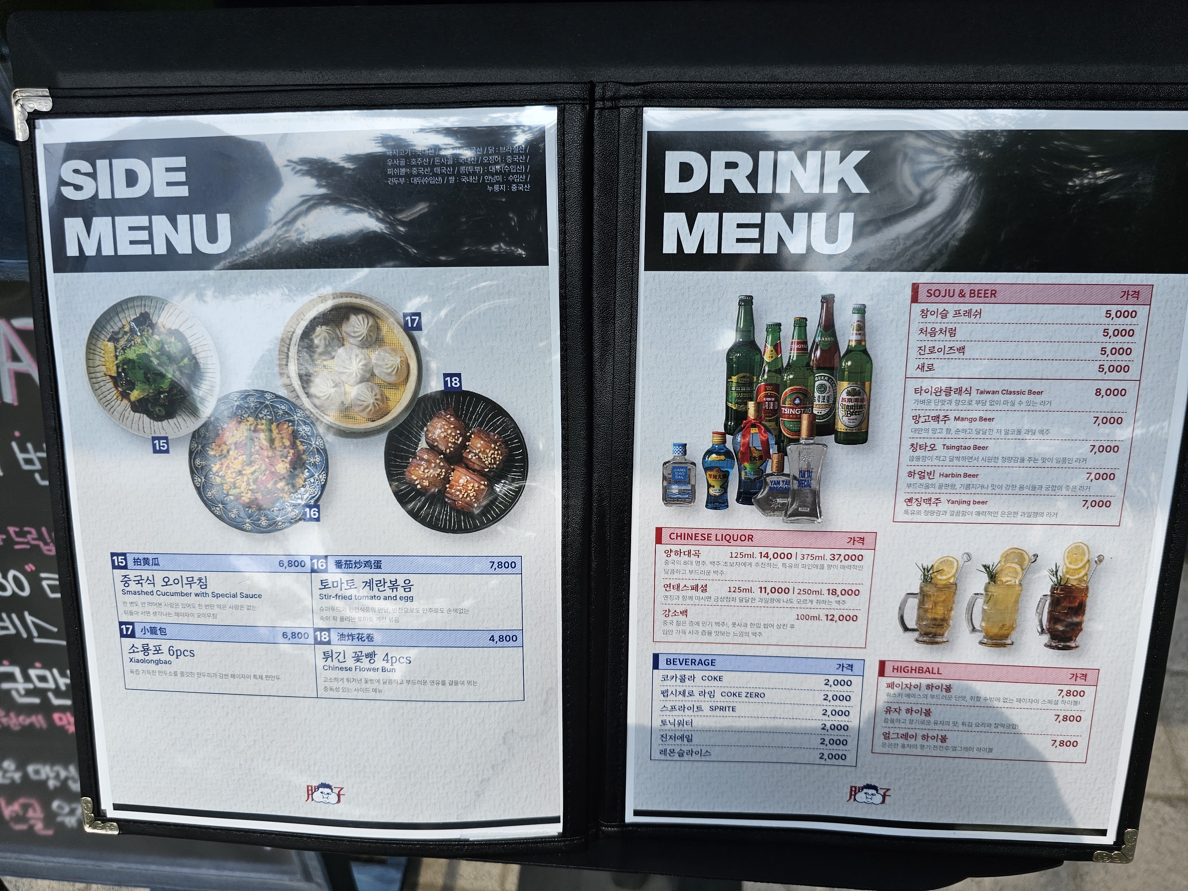 사이드 메뉴로는 중국식 오이무침, 토마토 계란볶음처럼 찐 중국 느낌의 사이드도 팔고 있네요. 술은 고량주도 팔고 하이볼도 팔고, 일반적인 소주와 중국 맥주도 팔고 있습니다.