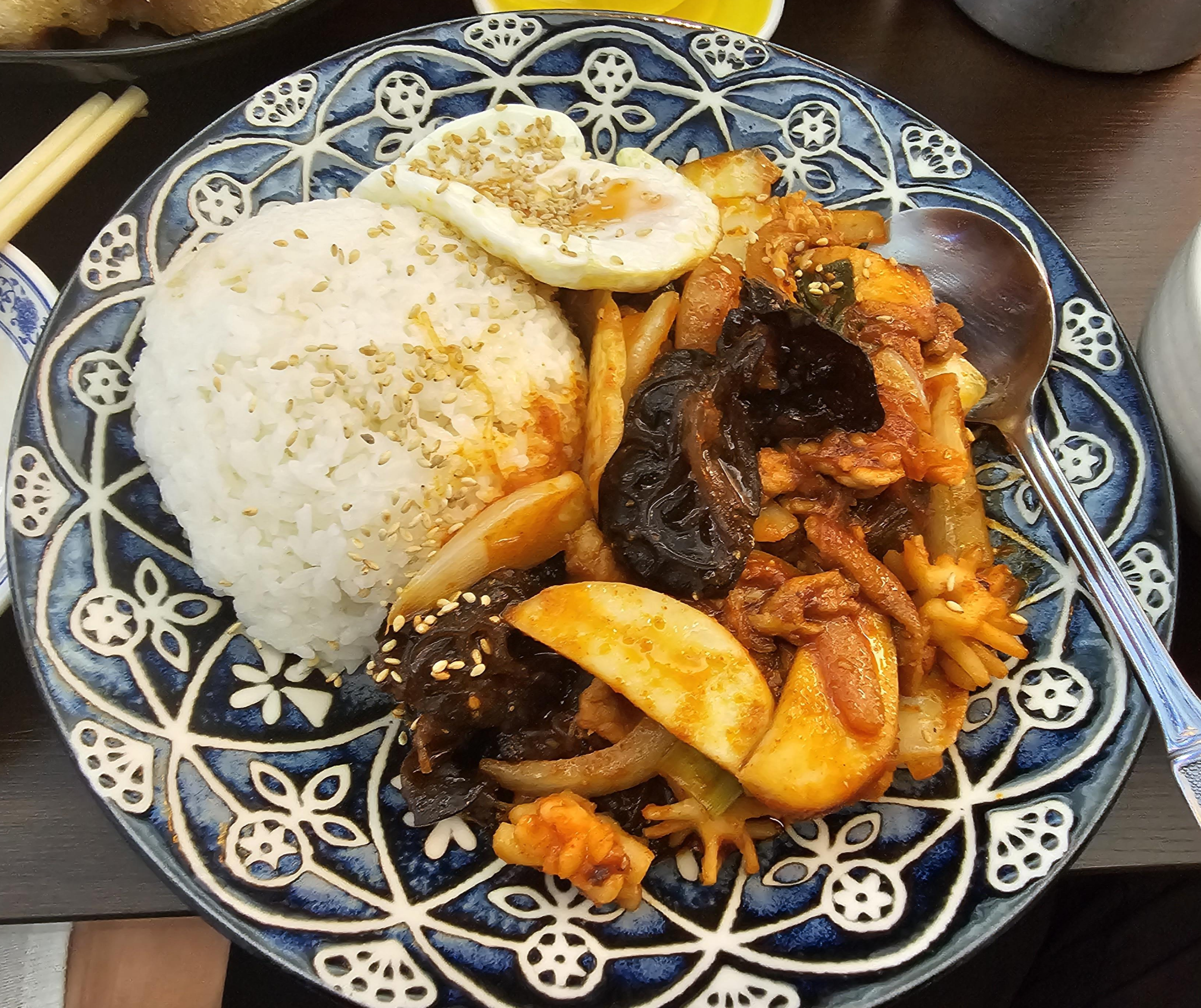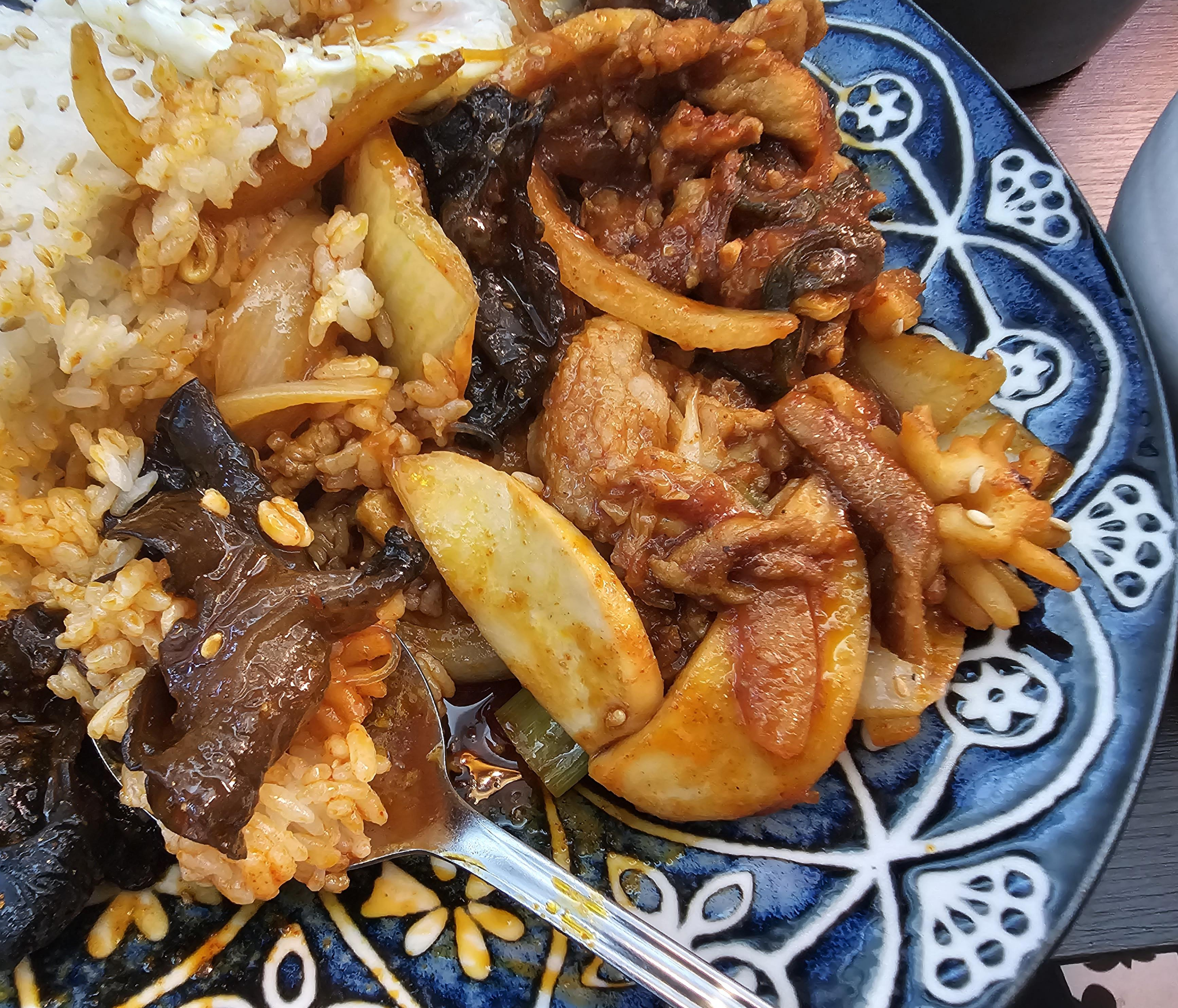 개인적으론 고기가 좀 적은 느낌이었는데, 약간 마라맛도 나는 게 맛있었습니다. 버섯과 양념이 잘 어울리고, 밥과도 어울리는 맛이었습니다. 다만 양념을 잘 흡수하는 양파와 목이버섯이 좀 더 많았다면 더 좋았을 것 같네요.