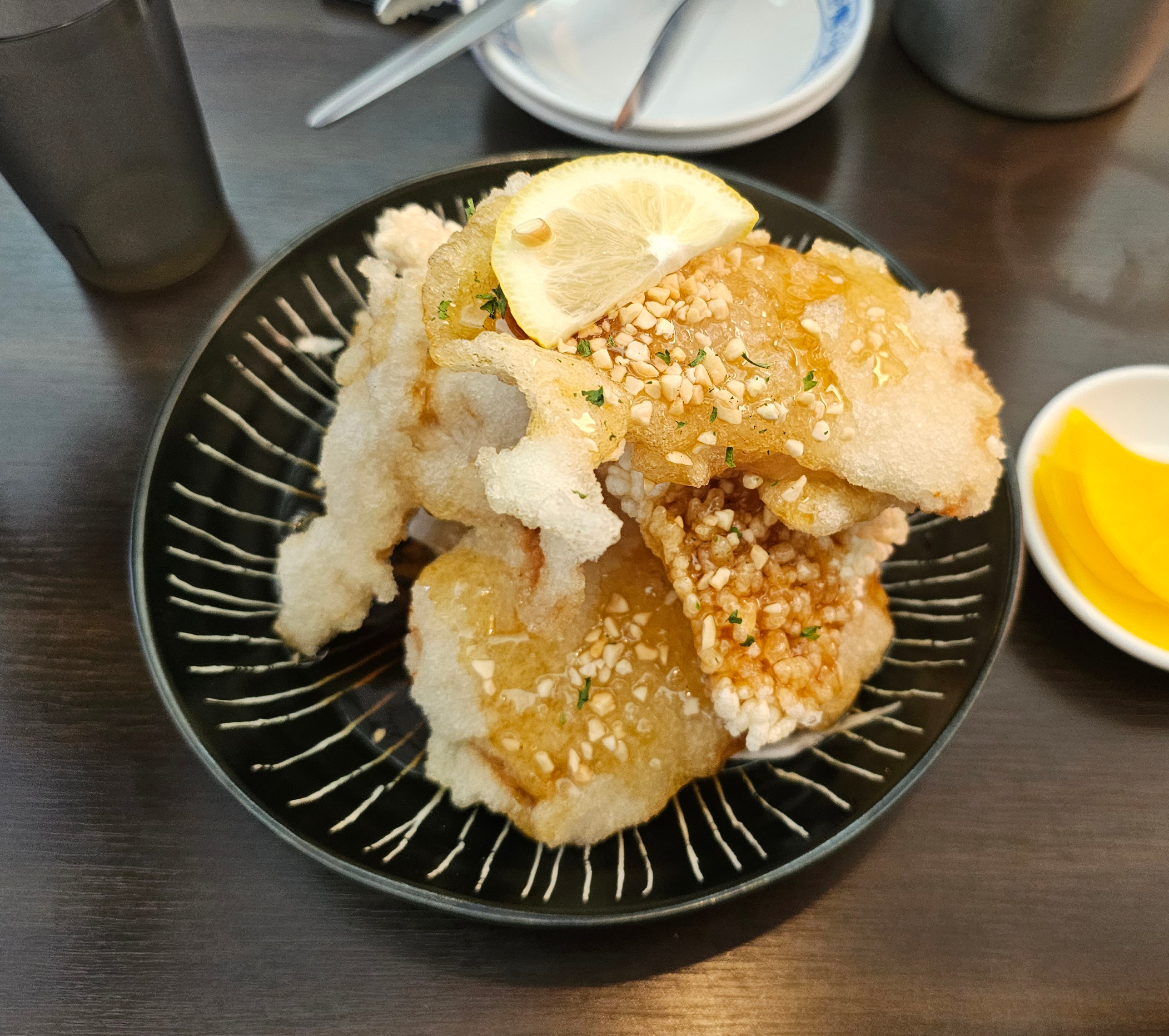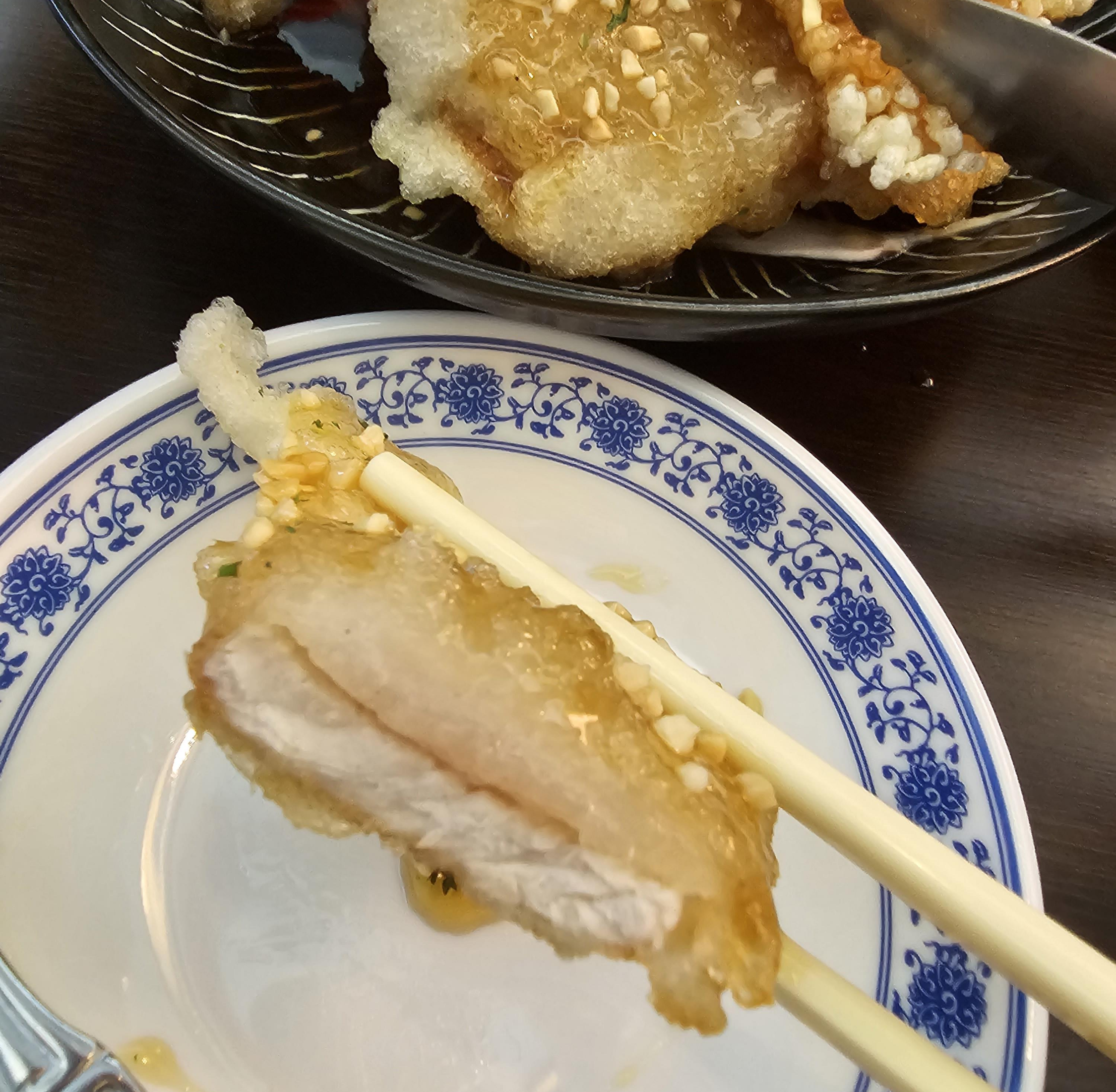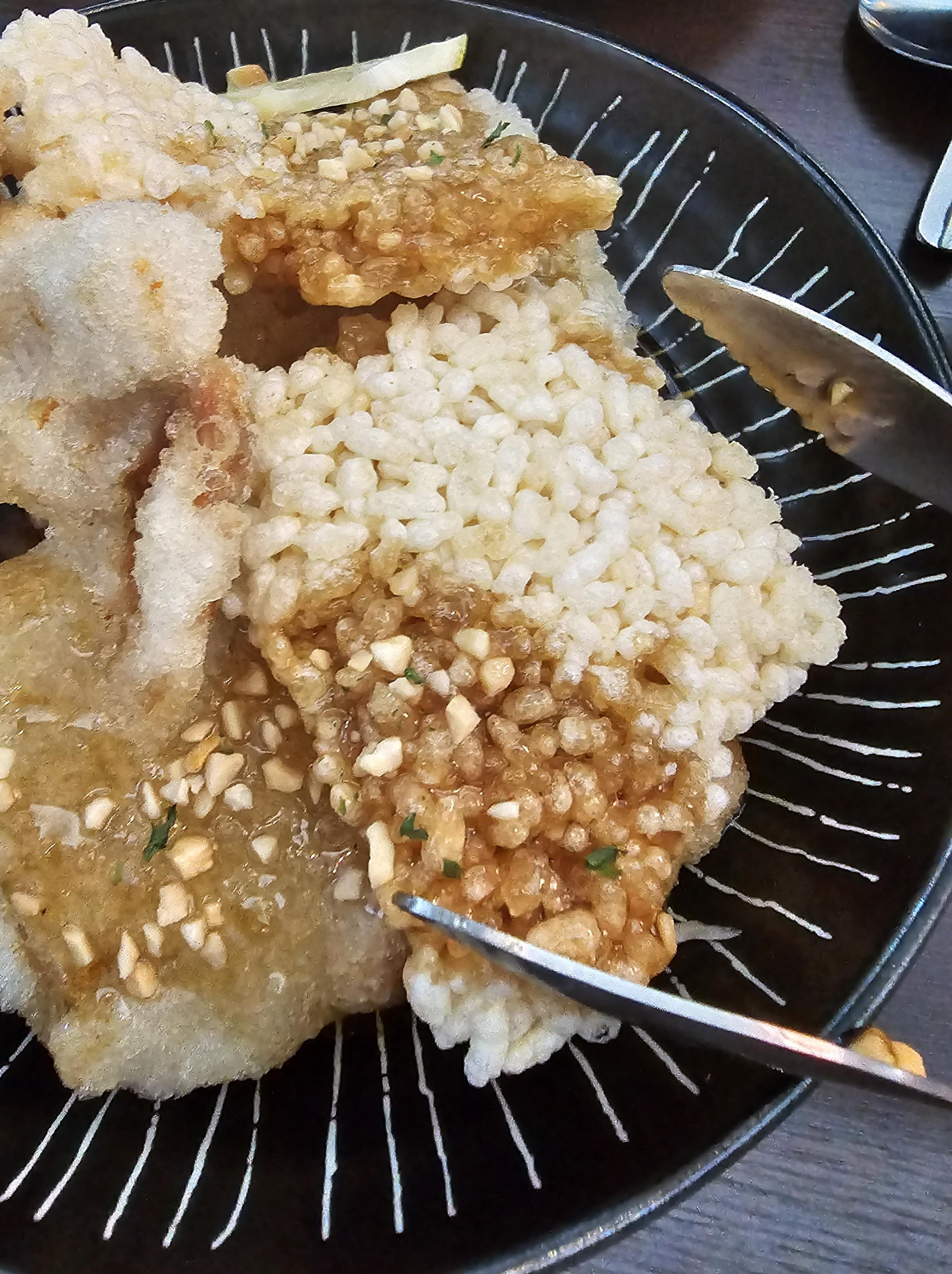 먼저 한돈 꿔바로우가 나왔는데, 1~2인용 치고는 꽤 양이 많아 보였는데, 사실 안에 2조각은 누룽지였습니다. 꿔바로우는 나오자마자 먹은 건 맛있었는데 맨 아래는 약간 눅눅해져 있었습니다. 소스는 새콤한 느낌이었는데, 의외로 누룽지가 꿔바로우보다 더 소스와 어울리고 더 맛있었습니다.