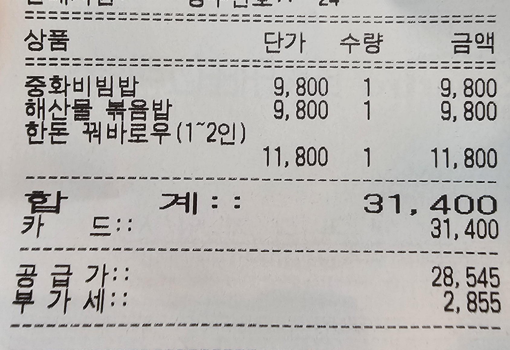 주문은 테이블에 있는 태블릿으로 하고 결제도 함께 할 수 있었고, 저희는 중화비빔밥(9,800원)과 해산물 볶음밥(9,800원) 그리고 한돈 꿔바로우(11,800원)를