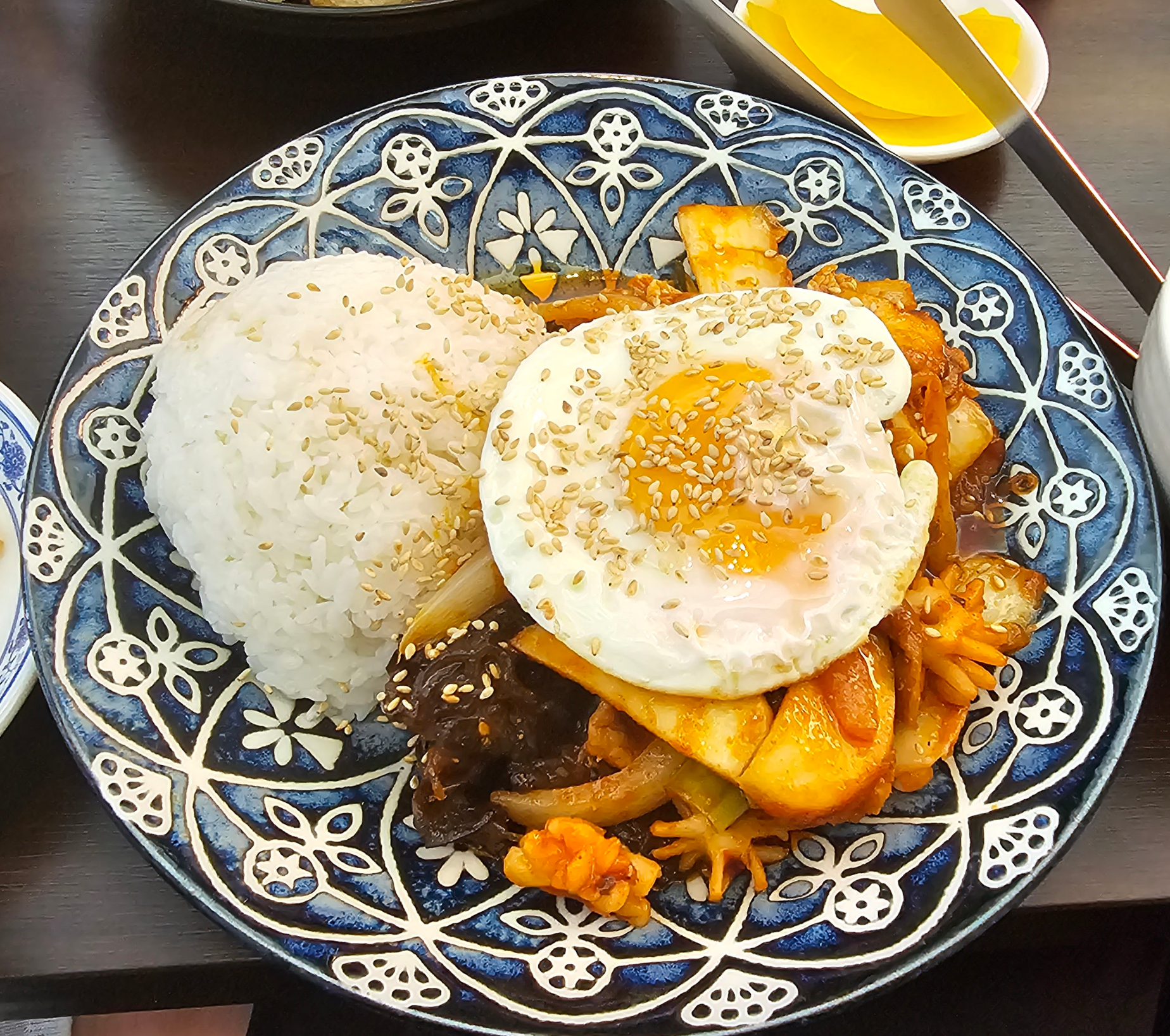 중화비빔밥은 밥과 계란프라이가 있었고, 계란프라이 아래에는 목이버섯, 새송이 버섯, 양파와 솔방울 오징어, 돼지고기등을 있었습니다.