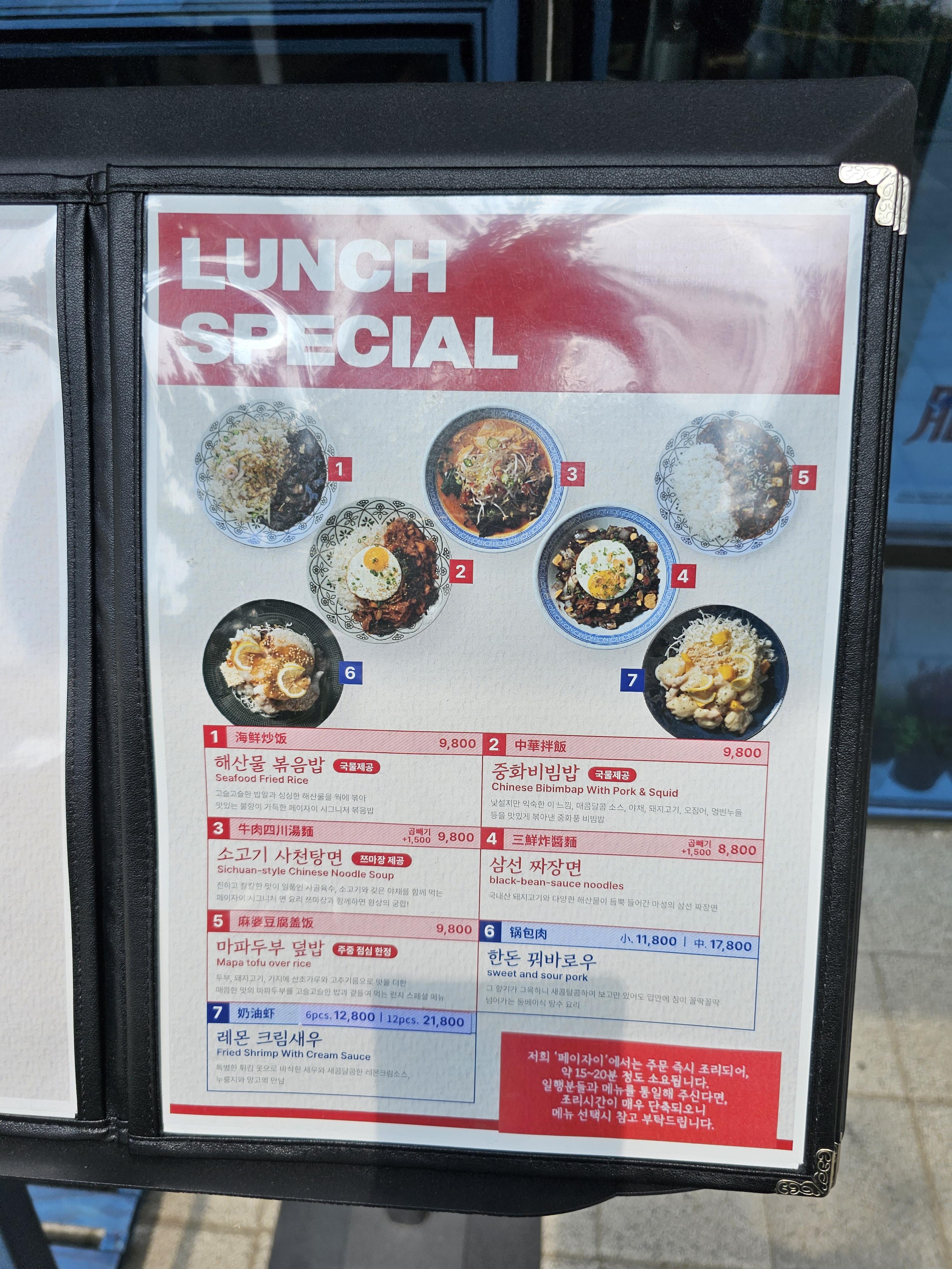 점심 메뉴는 해산물 볶음밥, 중화비빔밥, 소고기 사천탕면, 삼선 짜장면, 마파두부 덮밥과 한돈 꿔바로우, 레몬 크림새우를 팔고 있습니다. 주문 시 15~20분이 걸린다고 안내가 되어있네요.