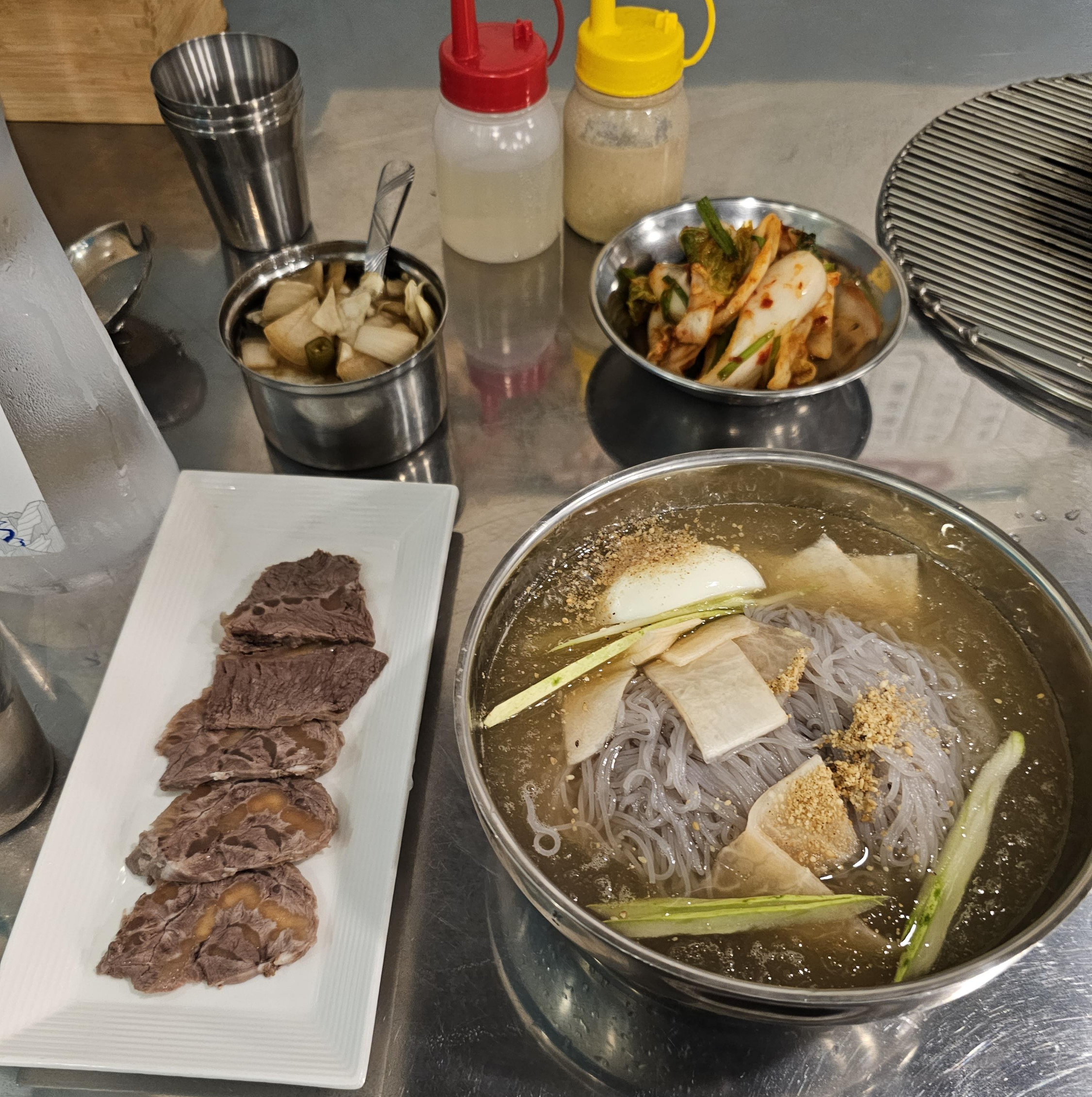 겨자와 식초를 뿌려서 먹는데 의외로 김치와 잘 어울려서 신기했네요. 식초가 다시마 식초라고는 하는데 사실 일반 식초와의 차이는 잘 못 느꼈습니다. 전체적으로 무난한 물냉면이었습니다. 양도 괜찮았고, 요즘 물가 생각하면 가격도 괜찮은 것 같네요. 고기가 맘에 들어서 올여름 안에 이번에 안 먹어본 비빔냉면을 먹으려 재방문할 것 같네요.