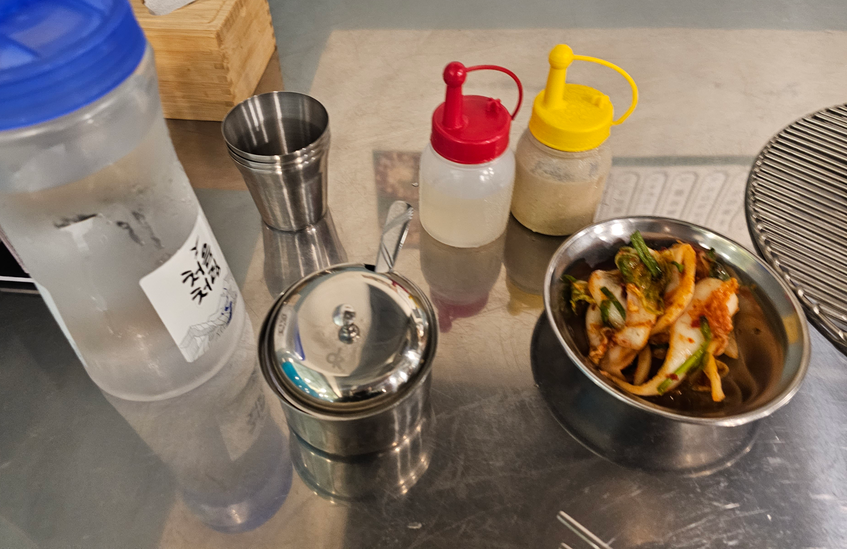 반찬으론 겉절이가 나오는데 맛있었습니다. 그리고 냉면에 필수인 식초와 겨자가 나오고 테이블마다 양파 장아찌가 비치되어있었습니다.