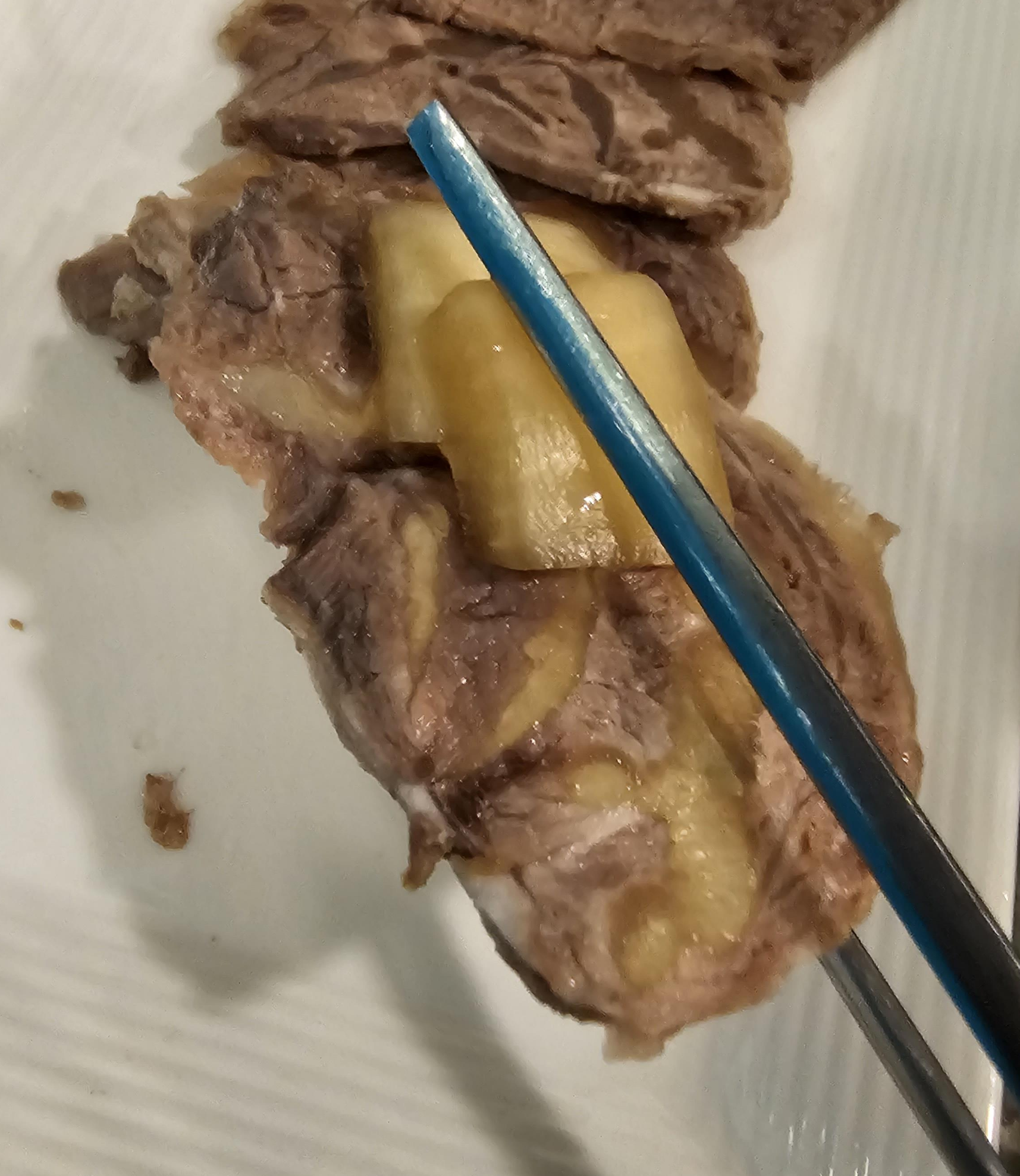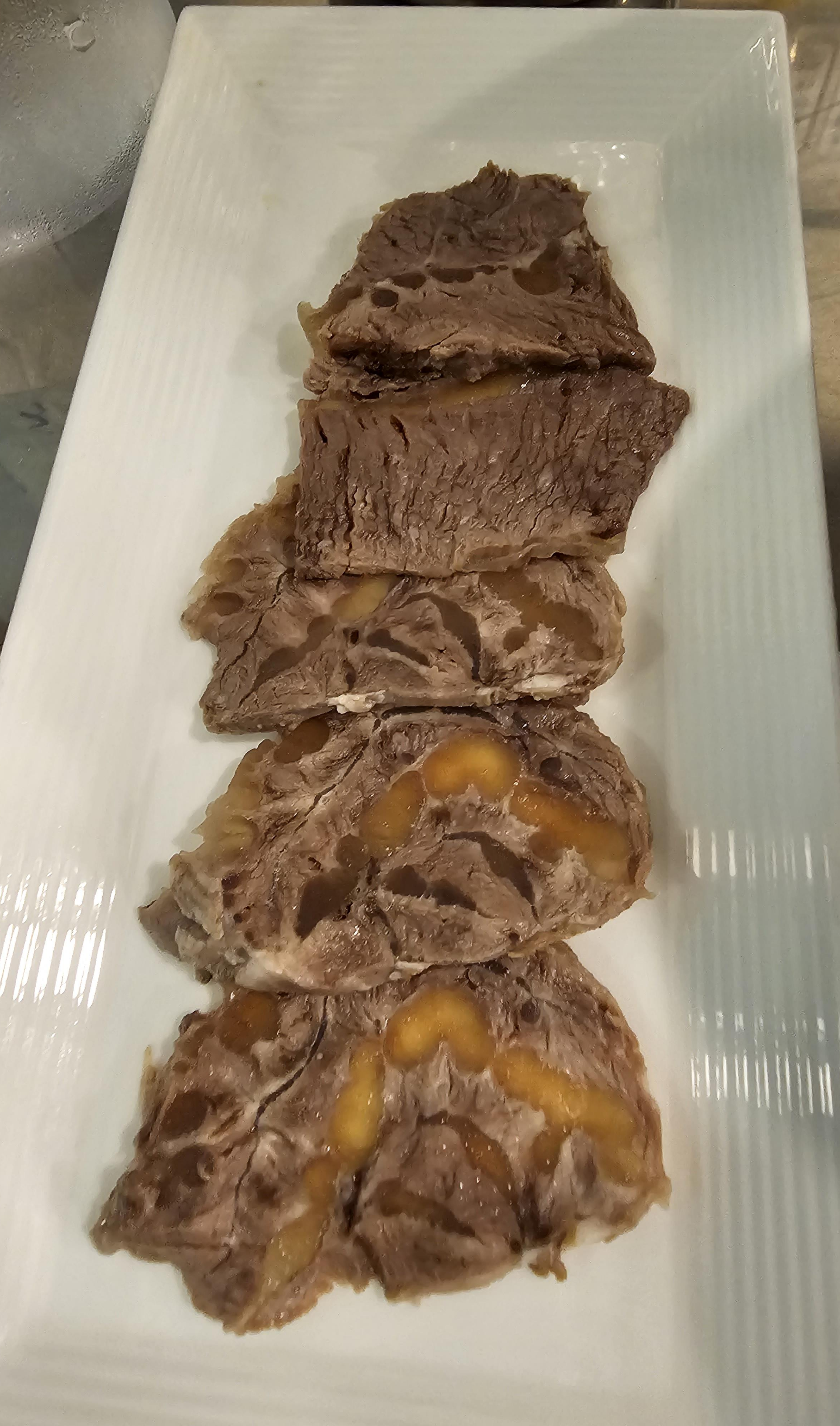 한우냉면이라는 이름이 궁금했는데, 소고기 5점 정도가 따로 나오네요. 냉면에 고기 토핑이 없고 따로 나온다는 점이 신기했습니다. 고기는 일반적으로 보던 고기와는 다르게 아롱사태? 같기도 하고 뭔가 더 먹음직스럽게 생겼습니다.