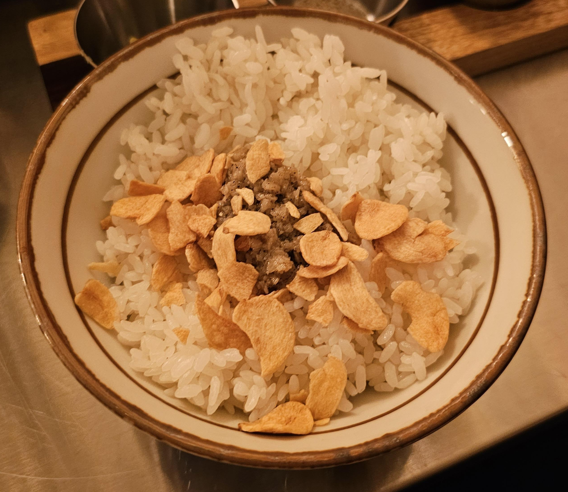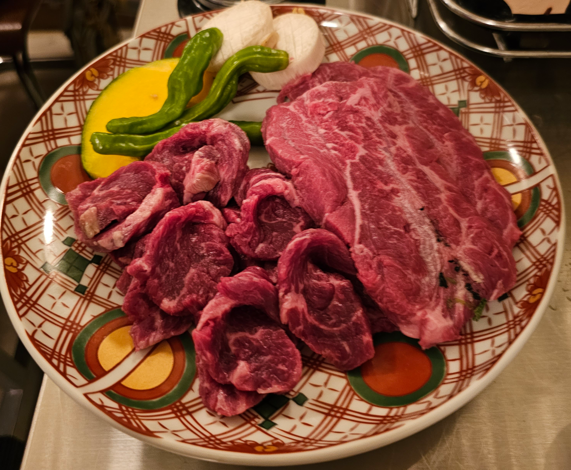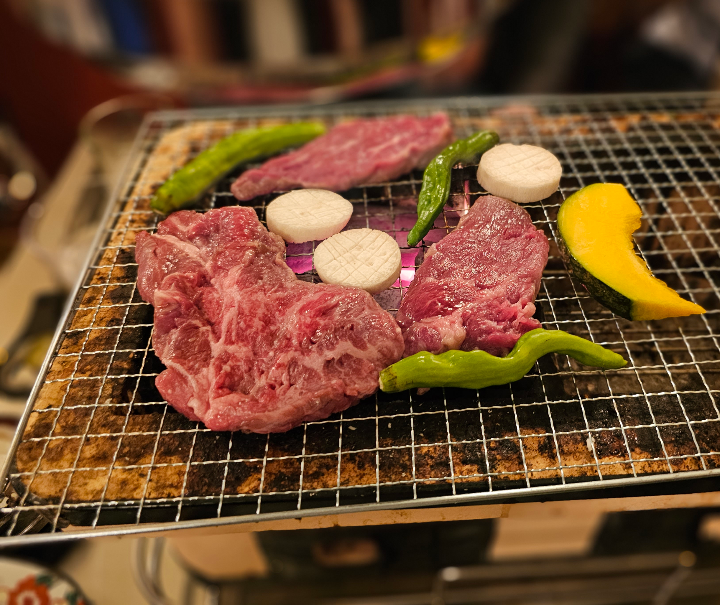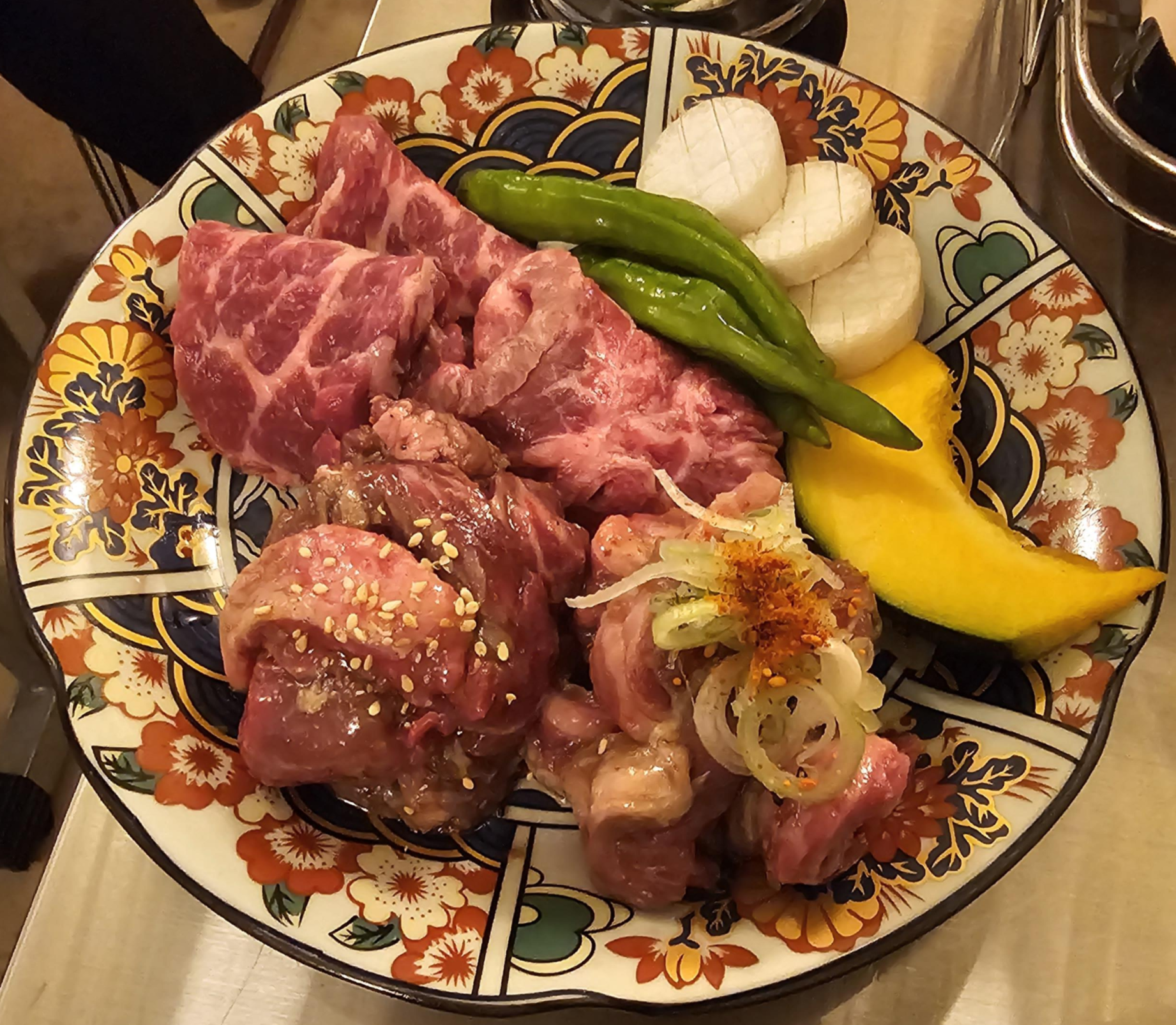 니꾸세트는 마늘밥과 고기로 구성되어 있는데, 소고기 340g으로 살치살, 토시살 부챗살, 늑간살로 구성된 고기와 마늘밥이 세트인 메뉴였습니다. 고기에는 호박과 버섯, 고추가 포함되어 잇는데, 고추는 구워도 꽤 매웠습니다. 마늘밥도 고기와 잘 어울리고 밥만 따로 먹어도 맛있었습니다.