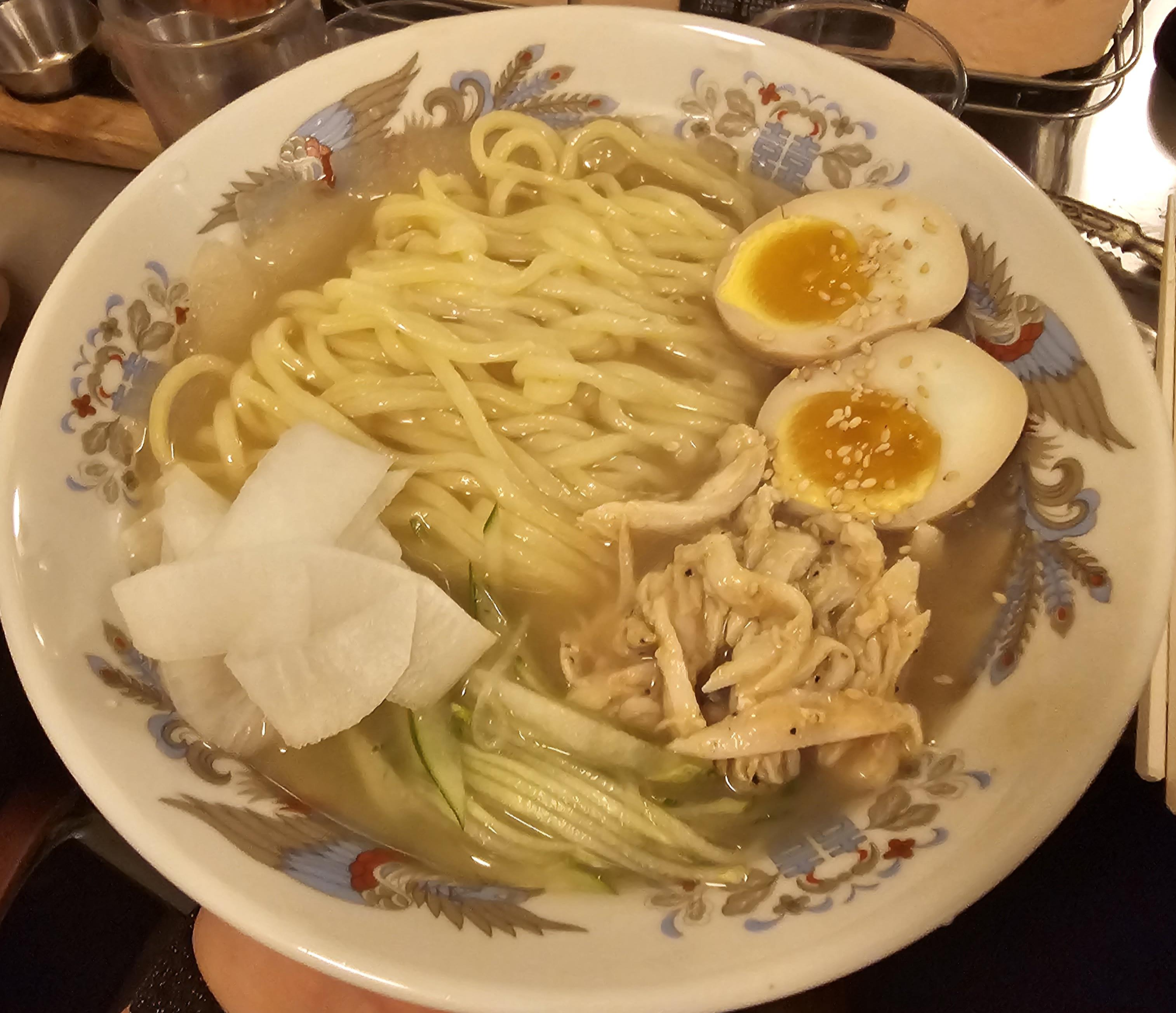 초계국수는 면이 중화면발 느낌이었고, 닭가슴살 같은 닭고기가 들어가 있었습니다. 국물은 새콤한 맛이라 기름지고 느끼한 것만 먹다가 먹으니 개운하고 좋았습니다.