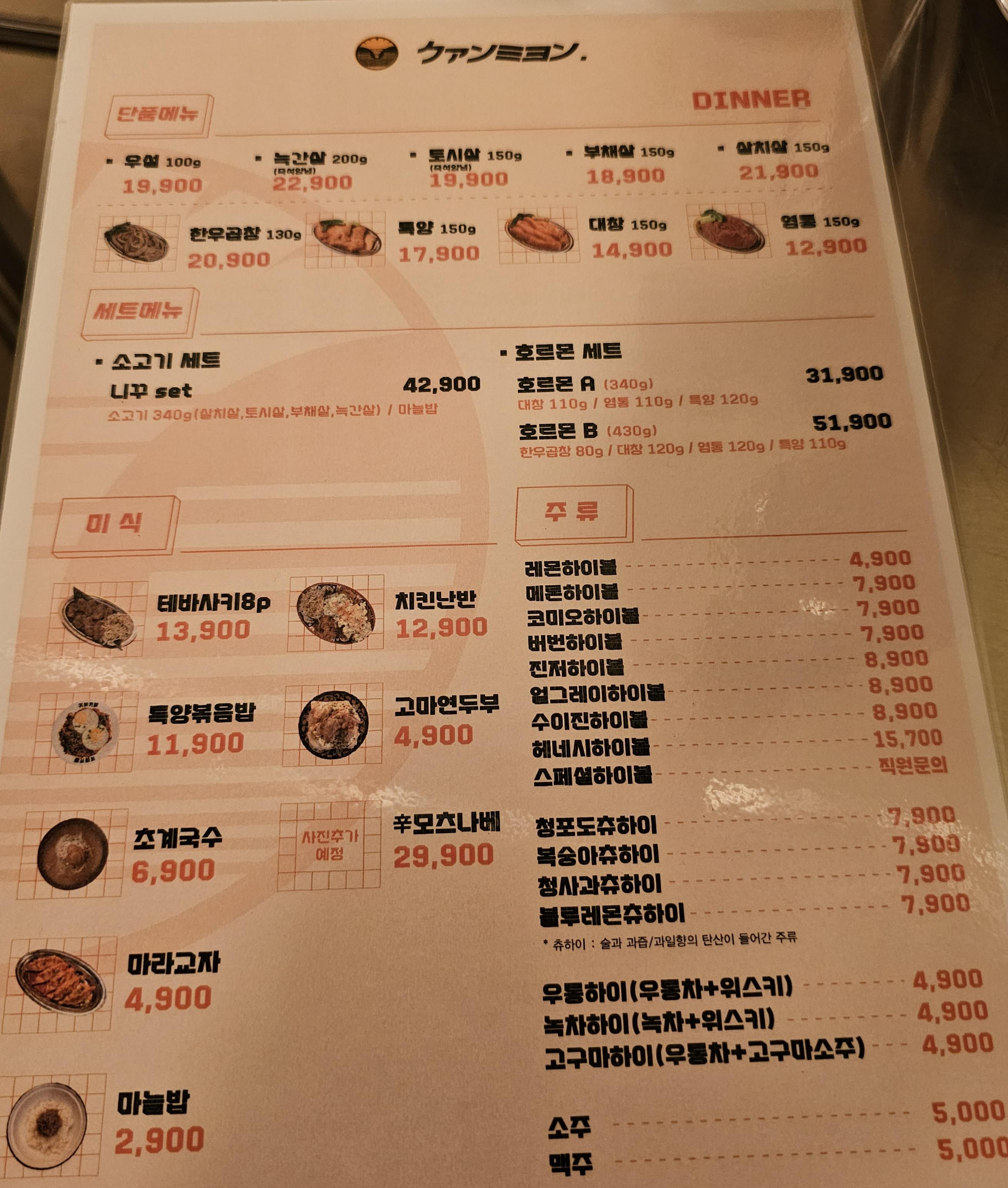 점심에는 라멘 종류를 팔고 있는 것 같습니다. 저녁은 한우곱창, 대창, 염통, 특양 같은 호르몬과 부챗살, 살치살, 우설 같은 소고기를 팔고 있었습니다.