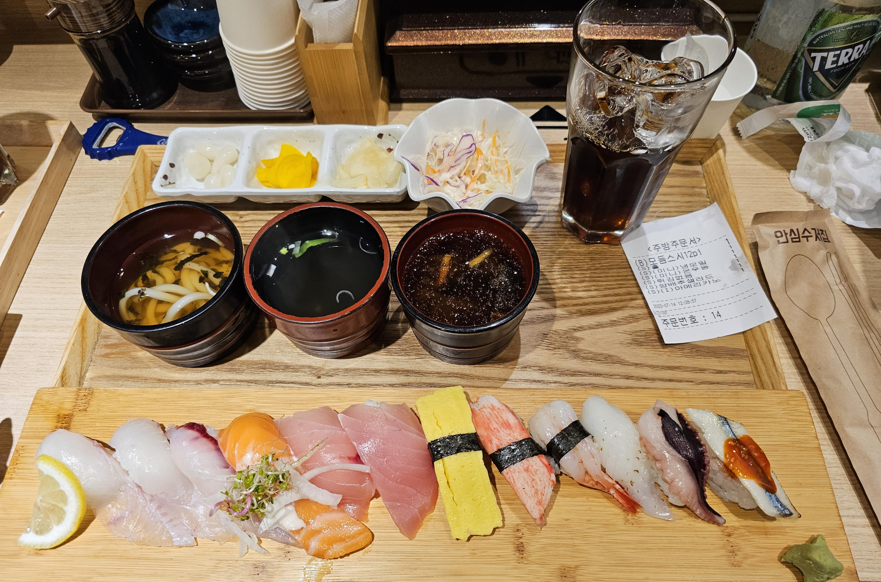 모듬스시 구성은 제가 선택한 미니 우동와 냉메밀 그리고 아이스 아메리카노와 미니 샐러드와 초밥 12피스와 장국 그리고 단무지등 반찬으로 구성되어 있어서 다른 초밥집보다 구성이 푸짐해 보였습니다.