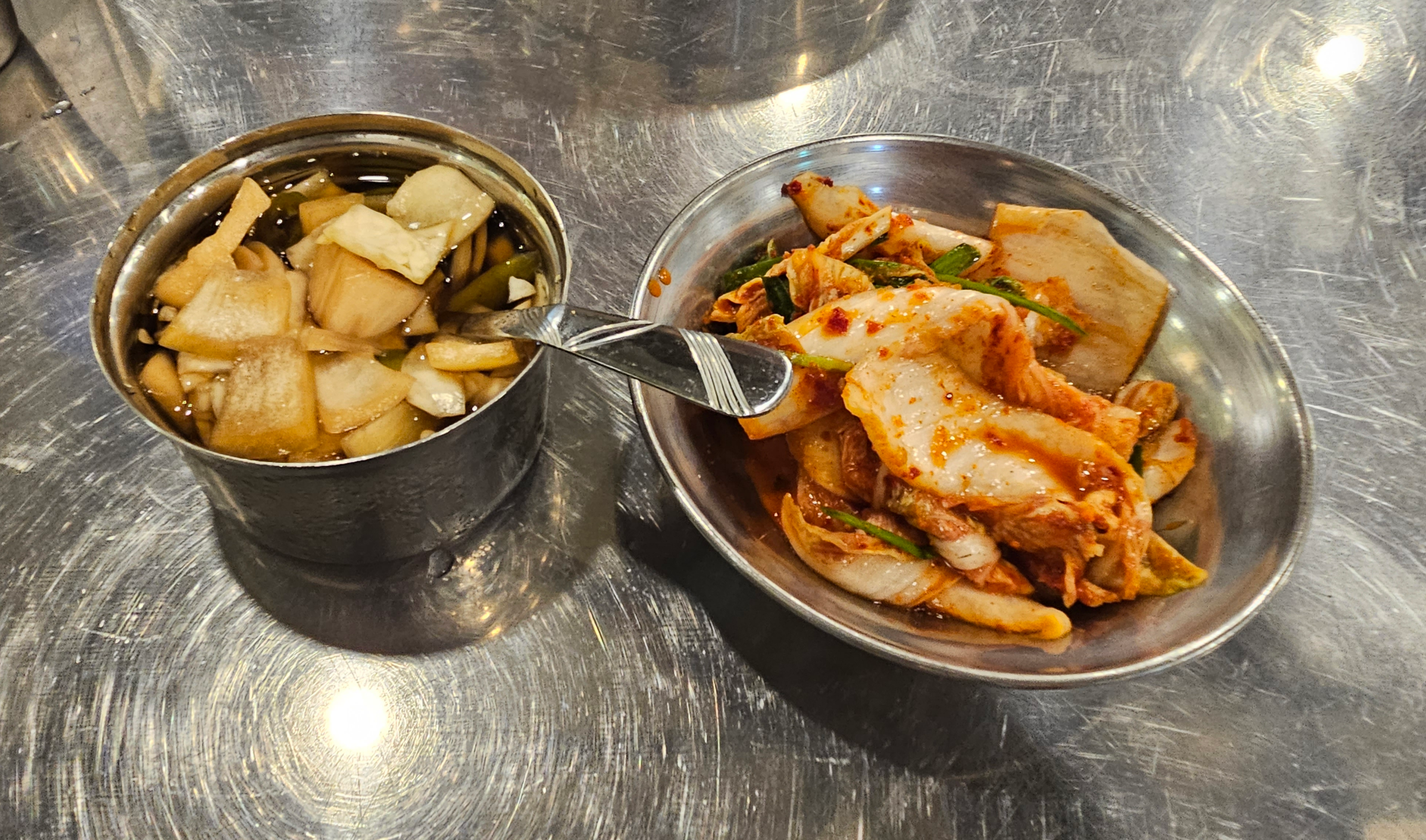 반찬은 겉절이가 나오고 고기와 함께 먹는 용도인 양파장아찌가 테이블에 배치되어 있습니다.