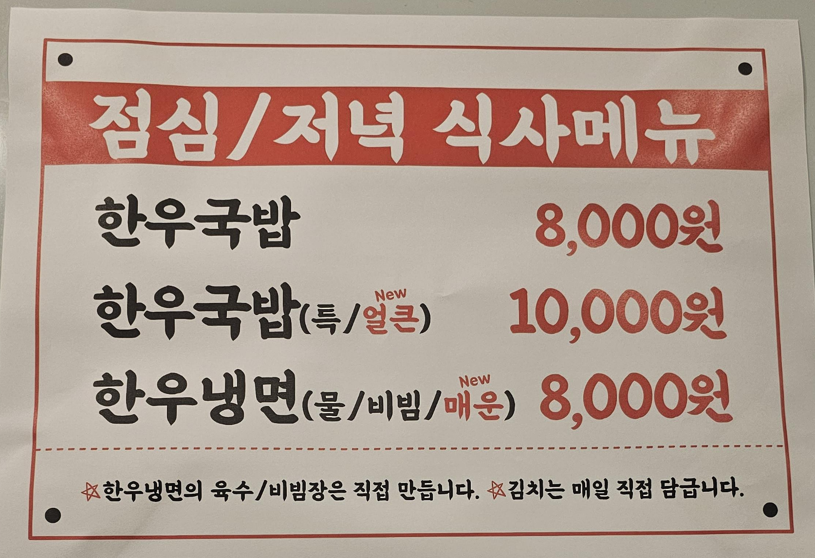 식사메뉴는 저번에도 봤지만 한우국밥과 한우냉면을 팔고 있었습니다. 한우국밥 특은 일반 한우국밥보다 고기 같은 게 더 많은 국밥이고 얼큰 한우국밥은 뚝배기에 나오는 얼큰한 국밥이라고 하네요. 저는 한우국밥 특(10,000원)으로 주문했습니다.