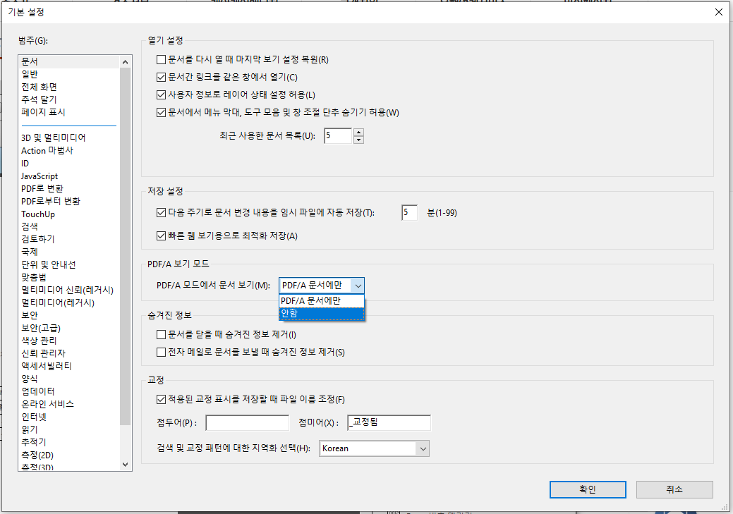 한글에서 찾는것을 포기하고 아크로뱃 프로에서 설정값들을 찾다보니 '편집 > 기본설정 > 문서'에서 PDF/A 보기 모드 설정을 발견했고, 해당 옵션을 안함으로 설정하니 정상적으로 수정이 되었습니다.