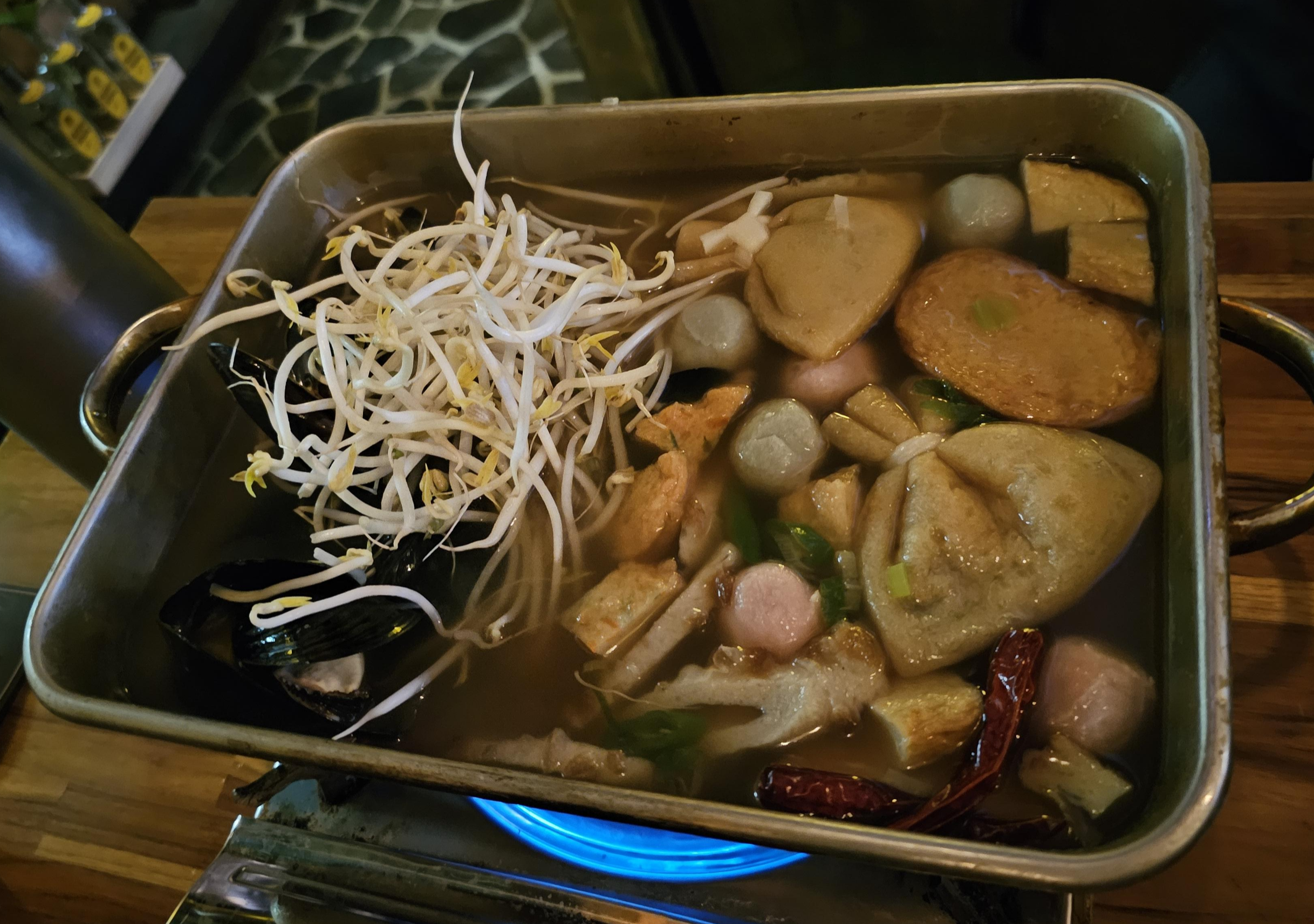 간사이어묵탕은 네모난 냄비에 나오는데, 반절에는 어묵들이 나머지 반에는 홍합과 숙주가 들어가 있었습니다.