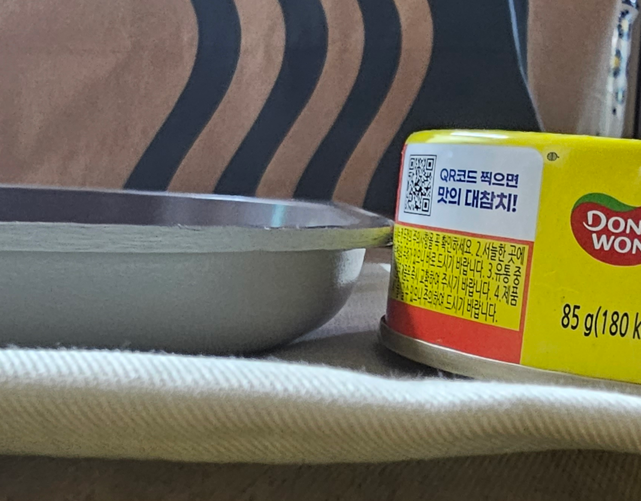 크기 비교를 위해 참치캔과 찍어 봤습니다. 팬크기는 적당한 크기 같습니다. 높이는 참치캔의 절반 정도 높이네요.