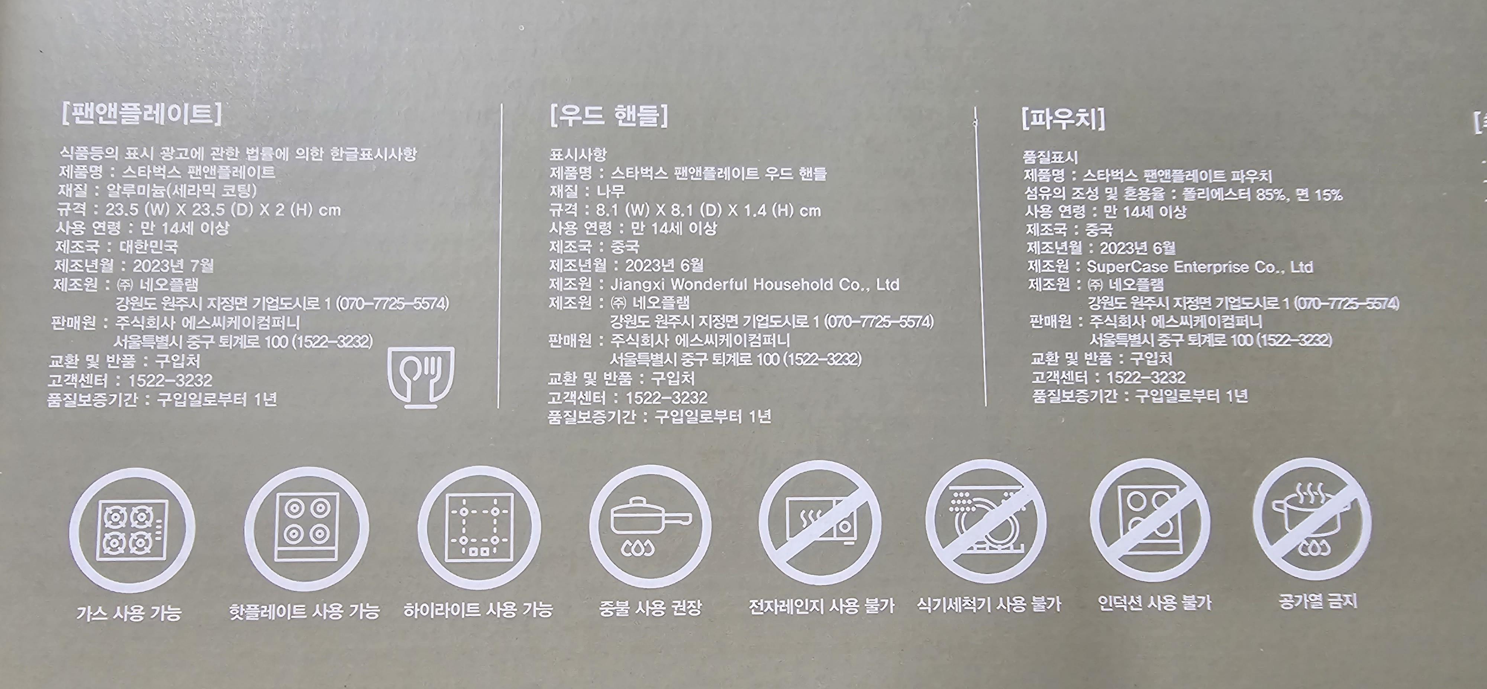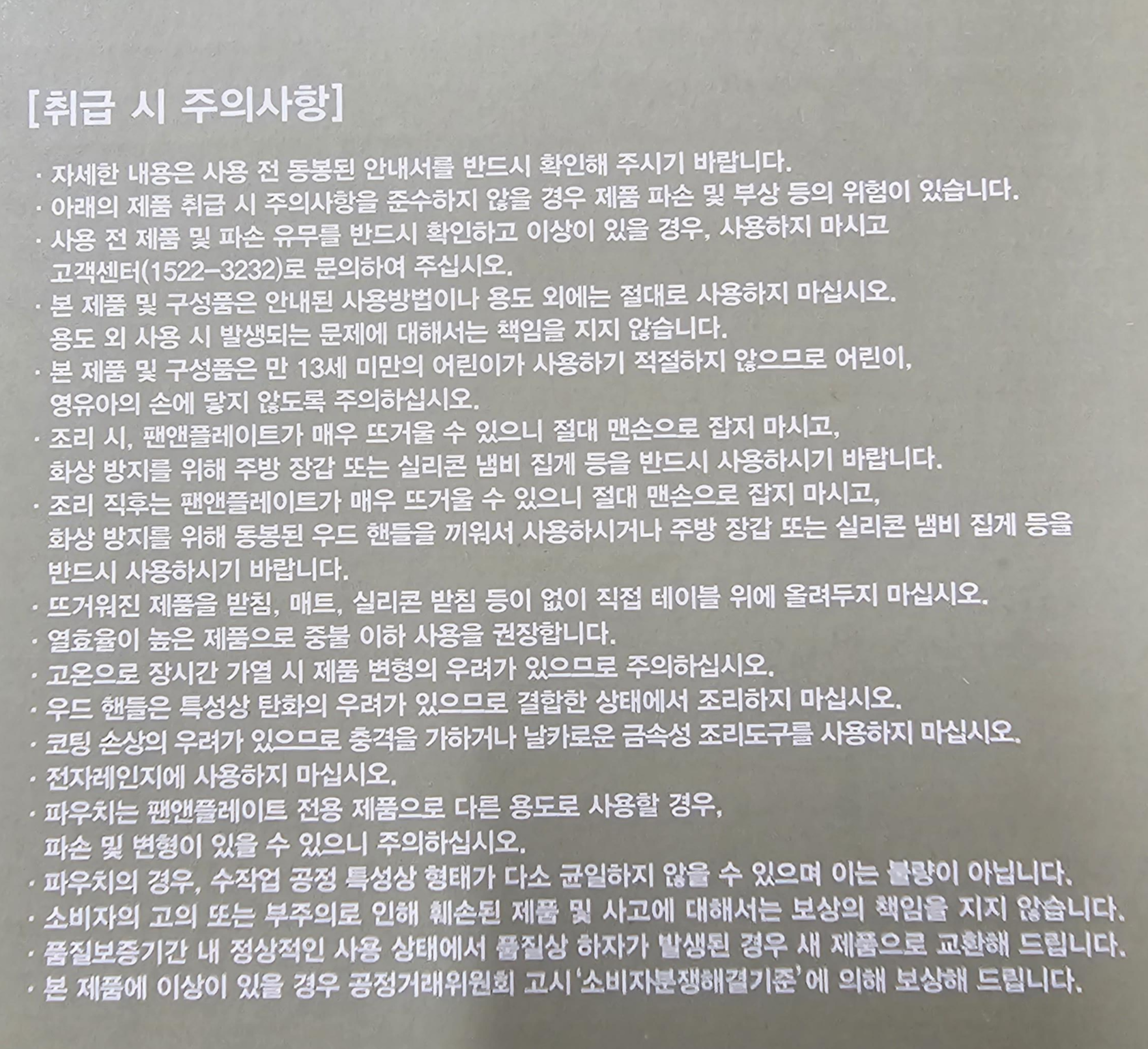 뒷면에는 구성품 설명과 취급시 주의사항이 적혀있네요. 인덕션에서 안 되는 건 아쉽네요. 그래도 가스레인지는 가능하다고 합니다.