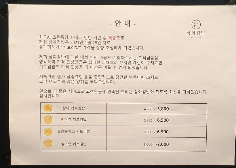 메뉴판... 키토 김밥은 비싸더군요. 가장싼게 5800원... 조류독감으로 1000원씩 인상이 됬다는군요... 사실 비싸서 나갈까 하다가 한번 먹어보자는 생각으로 키토김밥 4종류를 구매... 가격은 25800원이었습니다.