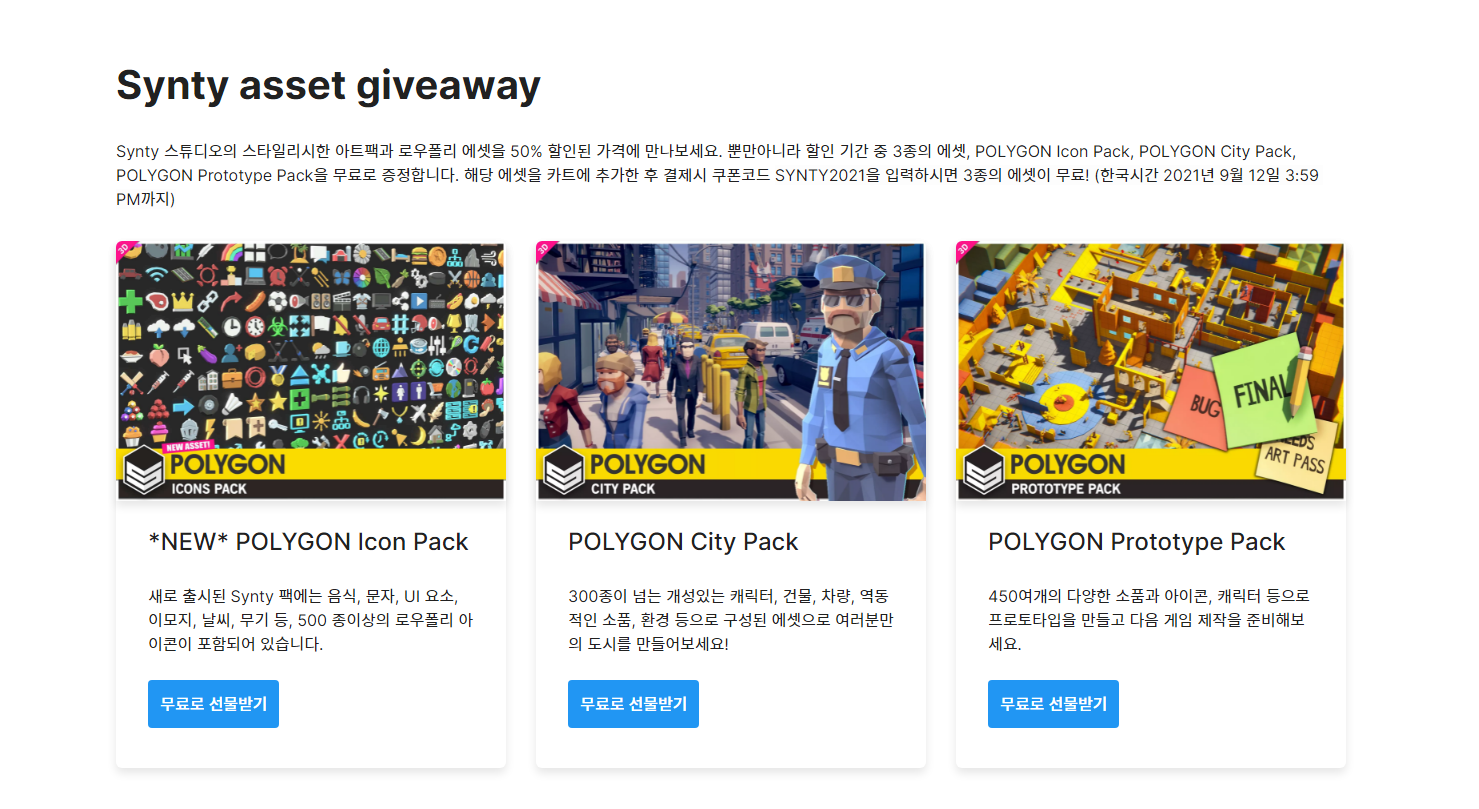 한국시간으로 오는 9월 1일 오후 4시부터 9월 12일 오후 3시 59분까지, Synty Studio의 전제품을 50% 할인된 가격에 만나보세요! 또, Synty Studio의 최신 제품인 POLYGON - Icons Pack을 포함한 3가지에셋이 무려 무료!