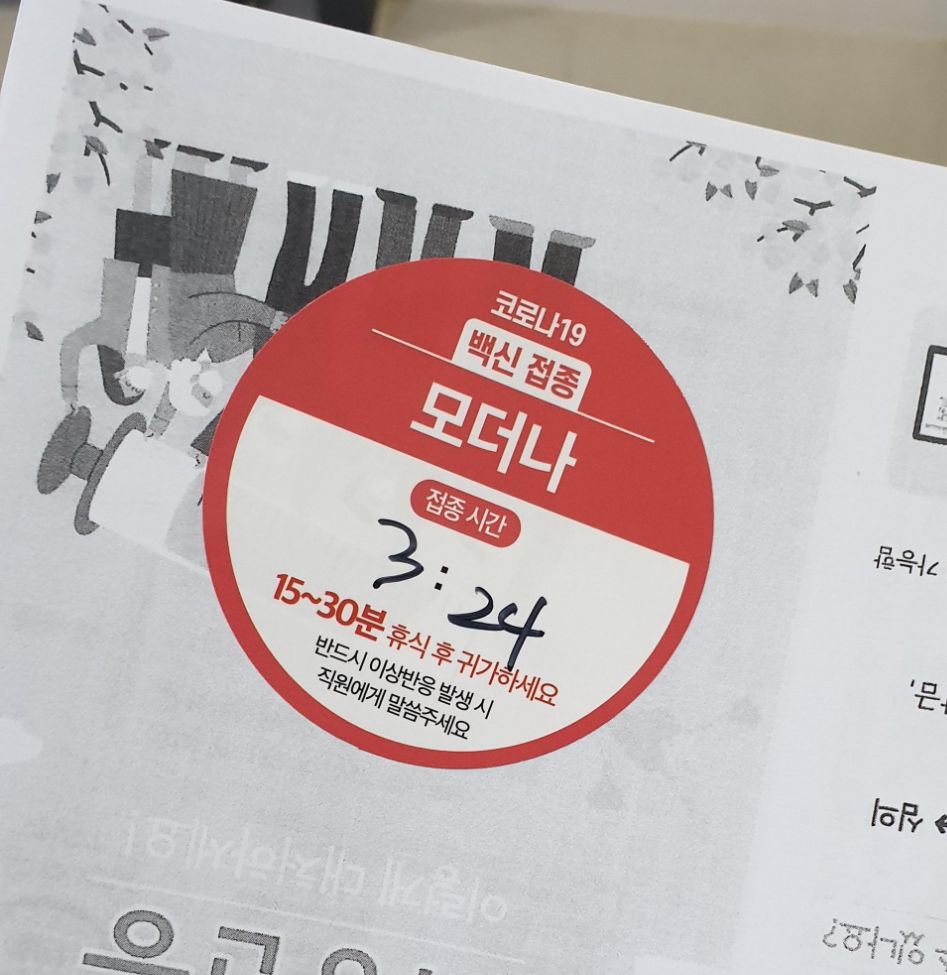 지금 보니 스티커에 접종시간이라고 적혀있네요. 병원에서는 '이 시간 지나시면 가세요.'라고 하셨는데 대기 시간 계산해서 적어주신 것 같습니다. 안내문 하고 이상반응에 대한 설명문 총 A4 2장 받고 스티커에 적혀 있던 시간 지나고 집에 왔습니다.